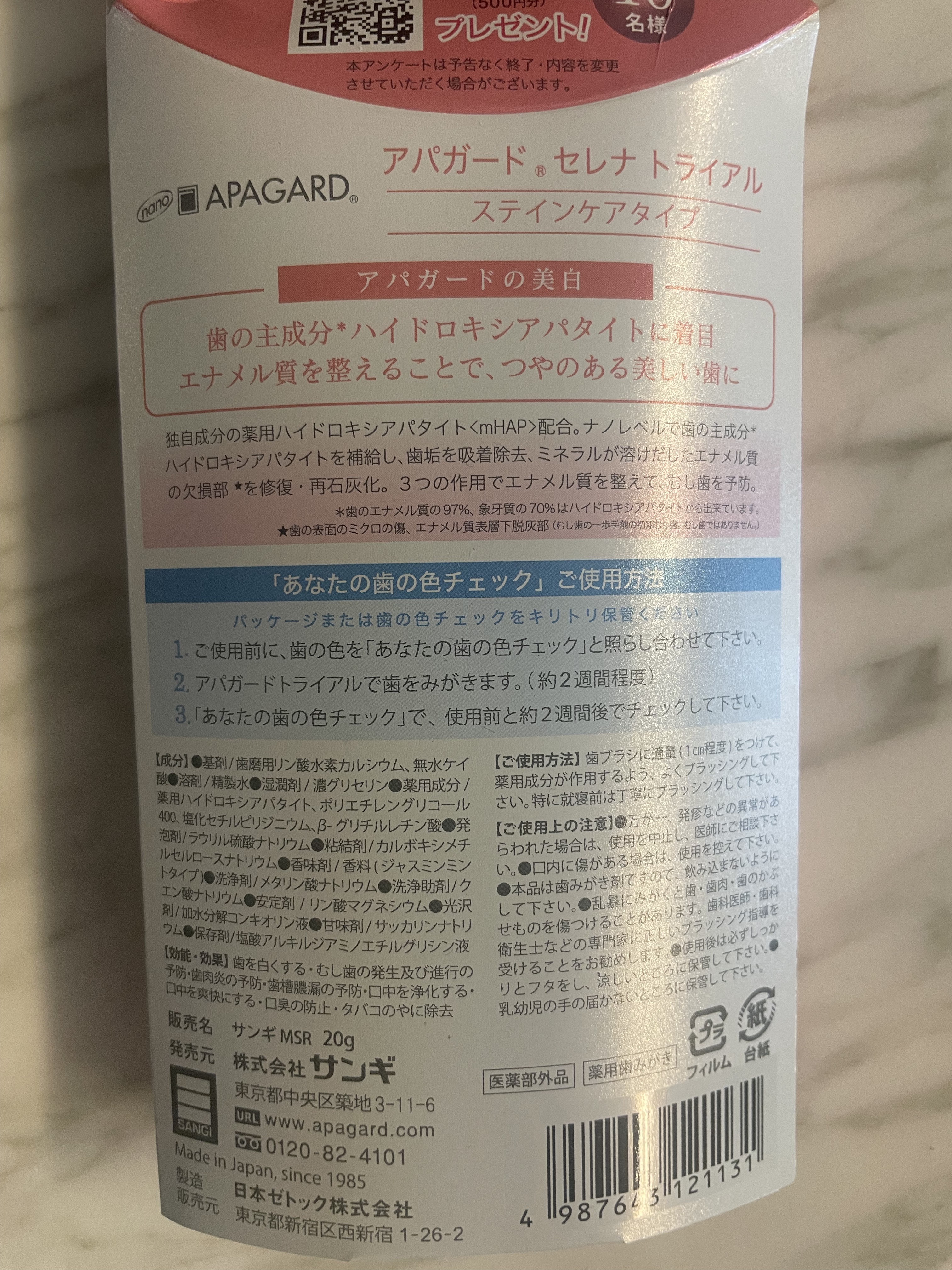 - 【医薬部外品】 美白歯みがき「アパガード」シリーズのステインケアタイプ。サンギ開発のむし歯予防成分「薬用ハイドロキシアパタイト」を配合。歯とほぼ同じ成分(歯のエナメル質の97%はハイドロキシアパタイト)で、エナメル質にアプローチ! さらにステインケア成分をダブル配合*し、コーヒーや紅茶・ワインなどの気になる着色汚れを落とします。 ステインケアではれやか白い歯に。 *メタリン酸ナトリウム(洗浄剤)・クエン酸ナトリウム(洗浄助剤) ●医薬部外品/薬用歯みがき 販売名:サンギMSR