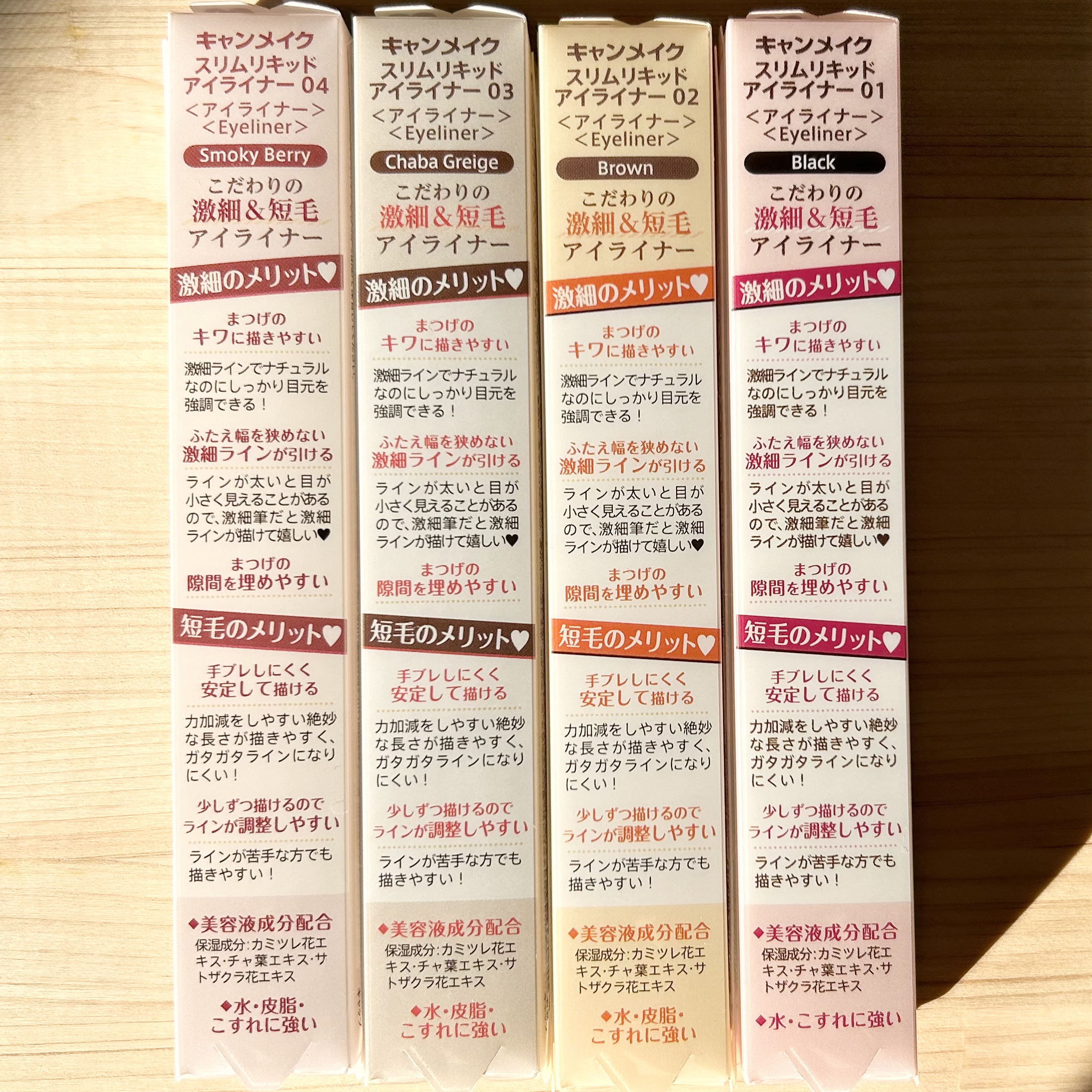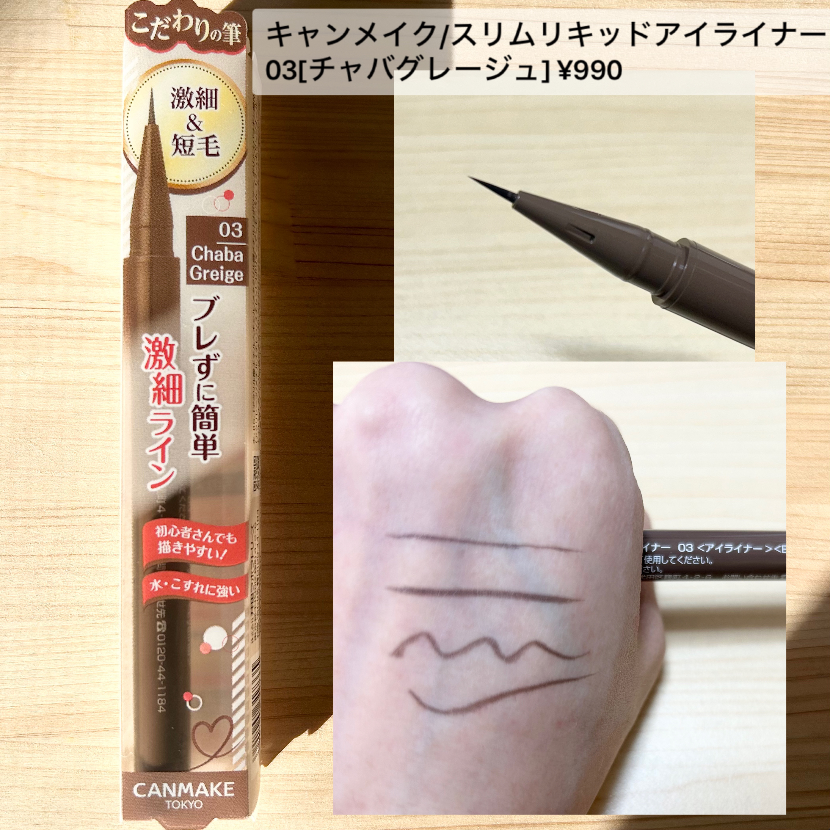 細いラインがとても引きやすかったです! 自分は不器用なのでやや手ブレはしましたが、調整がしやすかったです😆 01[ブラック]¥990 ツヤのあるブラック。1番落ちにくく感じました。 03[チャバグレージュ] ¥990 肌馴染みが良いので、挑戦しやすいグレージュだと思いました。