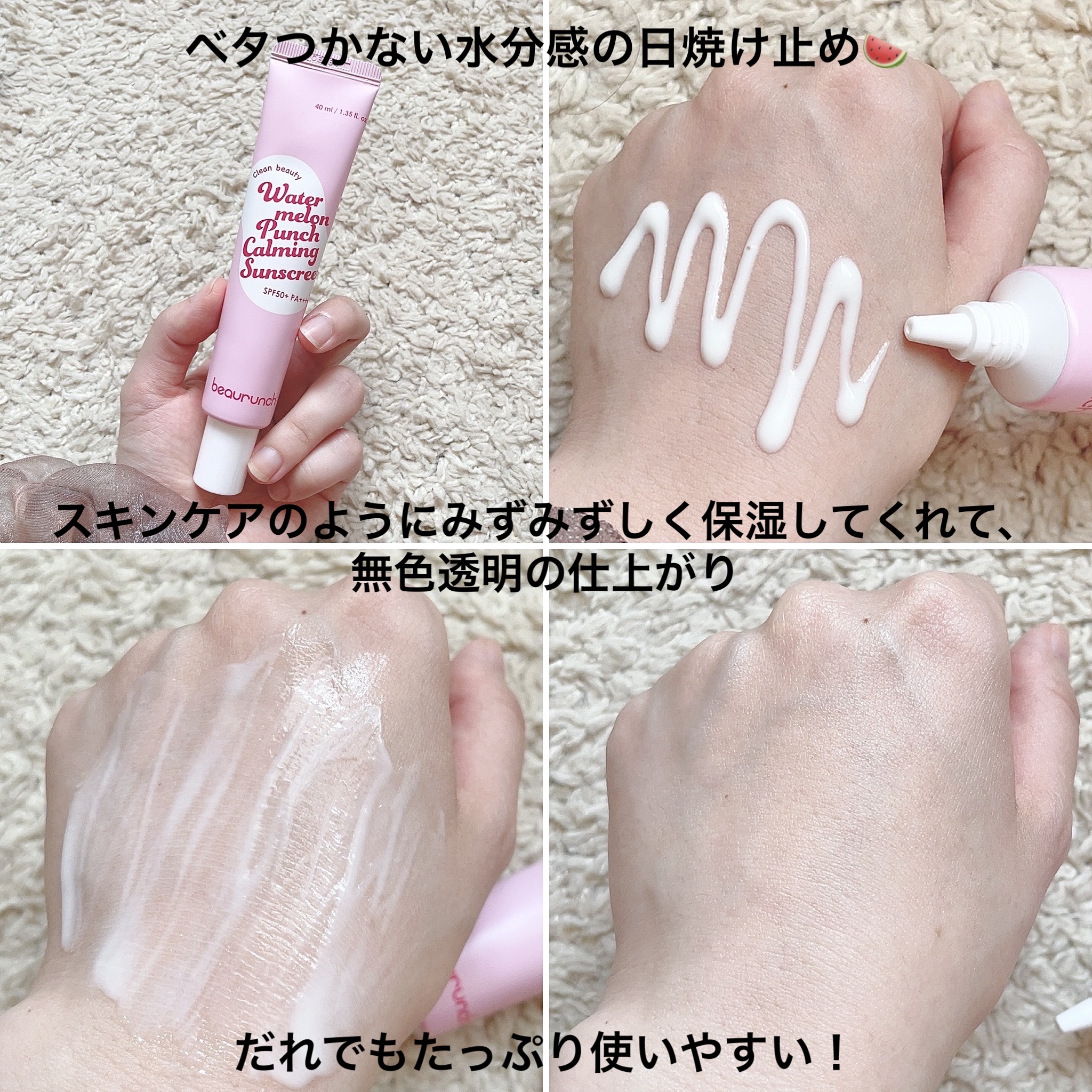 ◆2025使い切りレビューNo.53ビューランチウォーターメロンパンチカーミングサンスクリーンSPF50+PA++++すごくスイカの美味しそうな香りがする、スイカエキス配合の日焼け止め。テクスチャーも滑らかで瑞々しく、水分でもちもちするような...