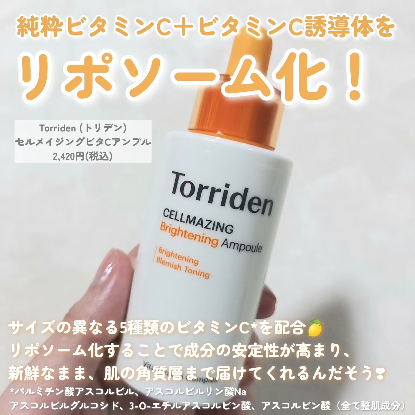 TorridenセルメイジングビタCブライトニングアンプル【商品の特徴】☑︎サイズの異なる5種類ビタミンC※1をリポソーム化!新鮮なまま、肌の角質層まで届ける✨※1パルミチン酸アスコルビルアスコルビルリン酸Naアスコルビルグルコシド3-O-エ...
