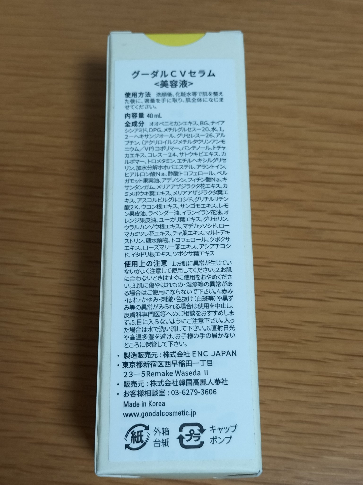 - ◆グーダル グリーンタンジェリンビタCダークスポットケアセラム 40ml 累積販売数:650万個*1 グーダルならではの厳格な基準*2を通過したこだわりの新鮮な済州無農薬青ミカンを直接収穫してAir Bubble Brewing工法で抽出 。生き生きとした印象の肌に。青みかんエキス(タンジェリンエキス)70%配合。乾燥によるくすみをケアし、透明感のある肌に導きます。 お肌のキメを整えるための整肌成分であるビタミンB3(ナイアシンアミド)が既存のグーダルグリーンタンジェリンビタCシミセラムプラスの2倍である4%になりました。 *1:2018.02~2023.09 全チャンネル販売数量基準|リニューアル製品を含む *2:7月中旬から8月中旬の間に獲れたての青ミカンの鮮度を現場ですぐに評価して選別し、超低温で管理、低い温度から直接抽出する青みかんエキス(整肌成分) <酸度>:㏗測定器、リトマス紙使用/酸度3.0~4.0かを確認 <果皮水分含量>:鮮度評価指標で皮の水分含量を測定