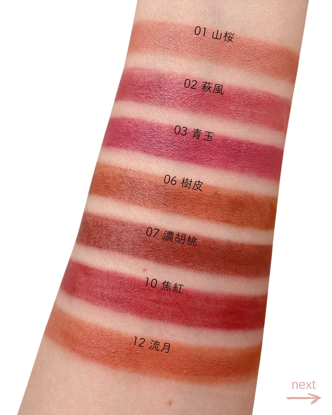 - <01 山桜> トリ(カプリル酸/カプリン酸)グリセリル、イソノナン酸イソトリデシル、ワセリン、水添ポリイソブテン、オクチルドデカノール、ラウロイルグルタミン酸ジ(オクチルドデシル/フィトステリル/ベヘニル)、パラフィン、マイクロクリスタリンワックス、ヒドロキシステアリン酸水添ヒマシ油、合成ワックス、ラウロイルグルタミン酸ジ(フィトステリル/オクチルドデシル)、ヒドロキシステアリン酸エチルヘキシル、水添マイクロクリスタリンワックス、リンゴ酸ジイソステアリル、トコフェロール、(エチレン/プロピレン)コポリマー、ポリエチレン、ジメチコン、オリーブ果実油、アーモンド油、ヒアルロン酸Na、(+/-)(チタン/酸化チタン)焼結物、シリカ、セルロース、マイカ、ラウロイルアスパラギン酸Na、ラウロイルリシン、塩化亜鉛、酸化チタン、酸化鉄、水酸化Al、硫酸Ba、トリイソステアリン酸イソプロピルチタン、トリエトキシカプリリルシラン、合成フルオロフロゴパイト、青1、赤104(1)、赤201、赤202 <02 萩風> トリ(カプリル酸/カプリン酸)グリセリル、イソノナン酸イソトリデシル、ワセリン、水添ポリイソブテン、オクチルドデカノール、ラウロイルグルタミン酸ジ(オクチルドデシル/フィトステリル/ベヘニル)、パラフィン、マイクロクリスタリンワックス、ヒドロキシステアリン酸水添ヒマシ油、合成ワックス、ラウロイルグルタミン酸ジ(フィトステリル/オクチルドデシル)、ヒドロキシステアリン酸エチルヘキシル、水添マイクロクリスタリンワックス、リンゴ酸ジイソステアリル、トコフェロール、(エチレン/プロピレン)コポリマー、ポリエチレン、ジメチコン、オリーブ果実油、アーモンド油、ヒアルロン酸Na、(+/-)(チタン/酸化チタン)焼結物、シリカ、セルロース、マイカ、ラウロイルアスパラギン酸Na、ラウロイルリシン、塩化亜鉛、酸化チタン、酸化鉄、水酸化Al、硫酸Ba、トリイソステアリン酸イソプロピルチタン、トリエトキシカプリリルシラン、合成フルオロフロゴパイト、青1、赤104(1)、赤201、赤202 <03 青玉> トリ(カプリル酸/カプリン酸)グリセリル、イソノナン酸イソトリデシル、ワセリン、水添ポリイソブテン、オクチルドデカノール、ラウロイルグルタミン酸ジ(オクチルドデシル/フィトステリル/ベヘニル)、パラフィン、マイクロクリスタリンワックス、ヒドロキシステアリン酸水添ヒマシ油、合成ワックス、ラウロイルグルタミン酸ジ(フィトステリル/オクチルドデシル)、ヒドロキシステアリン酸エチルヘキシル、水添マイクロクリスタリンワックス、リンゴ酸ジイソステアリル、トコフェロール、(エチレン/プロピレン)コポリマー、ポリエチレン、ジメチコン、オリーブ果実油、アーモンド油、ヒアルロン酸Na、(+/-)(チタン/酸化チタン)焼結物、シリカ、セルロース、マイカ、ラウロイルアスパラギン酸Na、ラウロイルリシン、塩化亜鉛、酸化チタン、酸化鉄、水酸化Al、硫酸Ba、トリイソステアリン酸イソプロピルチタン、トリエトキシカプリリルシラン、合成フルオロフロゴパイト、青1、赤104(1)、赤201、赤202 <04 紅玉色> トリ(カプリル酸/カプリン酸)グリセリル、イソノナン酸イソトリデシル、ワセリン、水添ポリイソブテン、オクチルドデカノール、ラウロイルグルタミン酸ジ(オクチルドデシル/フィトステリル/ベヘニル)、パラフィン、マイクロクリスタリンワックス、ヒドロキシステアリン酸水添ヒマシ油、合成ワックス、ラウロイルグルタミン酸ジ(フィトステリル/オクチルドデシル)、ヒドロキシステアリン酸エチルヘキシル、水添マイクロクリスタリンワックス、トコフェロール、(エチレン/プロピレン)コポリマー、ポリエチレン、オリーブ果実油、アーモンド油、ヒアルロン酸Na、(+/-)(チタン/酸化チタン)焼結物、シリカ、セルロース、マイカ、ラウロイルアスパラギン酸Na、ラウロイルリシン、塩化亜鉛、酸化チタン、酸化鉄、硫酸Ba、トリイソステアリン酸イソプロピルチタン、含水シリカ、合成フルオロフロゴパイト、黄4、黄5、赤201、赤202 <05 椎実> トリ(カプリル酸/カプリン酸)グリセリル、イソノナン酸イソトリデシル、ワセリン、水添ポリイソブテン、オクチルドデカノール、ラウロイルグルタミン酸ジ(オクチルドデシル/フィトステリル/ベヘニル)、パラフィン、マイクロクリスタリンワックス、ヒドロキシステアリン酸水添ヒマシ油、合成ワックス、ラウロイルグルタミン酸ジ(フィトステリル/オクチルドデシル)、ヒドロキシステアリン酸エチルヘキシル、水添マイクロクリスタリンワックス、リンゴ酸ジイソステアリル、トコフェロール、(エチレン/プロピレン)コポリマー、ポリエチレン、オリーブ果実油、アーモンド油、ヒアルロン酸Na、(+/-)(チタン/酸化チタン)焼結物、シリカ、セルロース、マイカ、ラウロイルアスパラギン酸Na、ラウロイルリシン、塩化亜鉛、酸化鉄、硫酸Ba、トリイソステアリン酸イソプロピルチタン、トリエトキシカプリリルシラン、合成