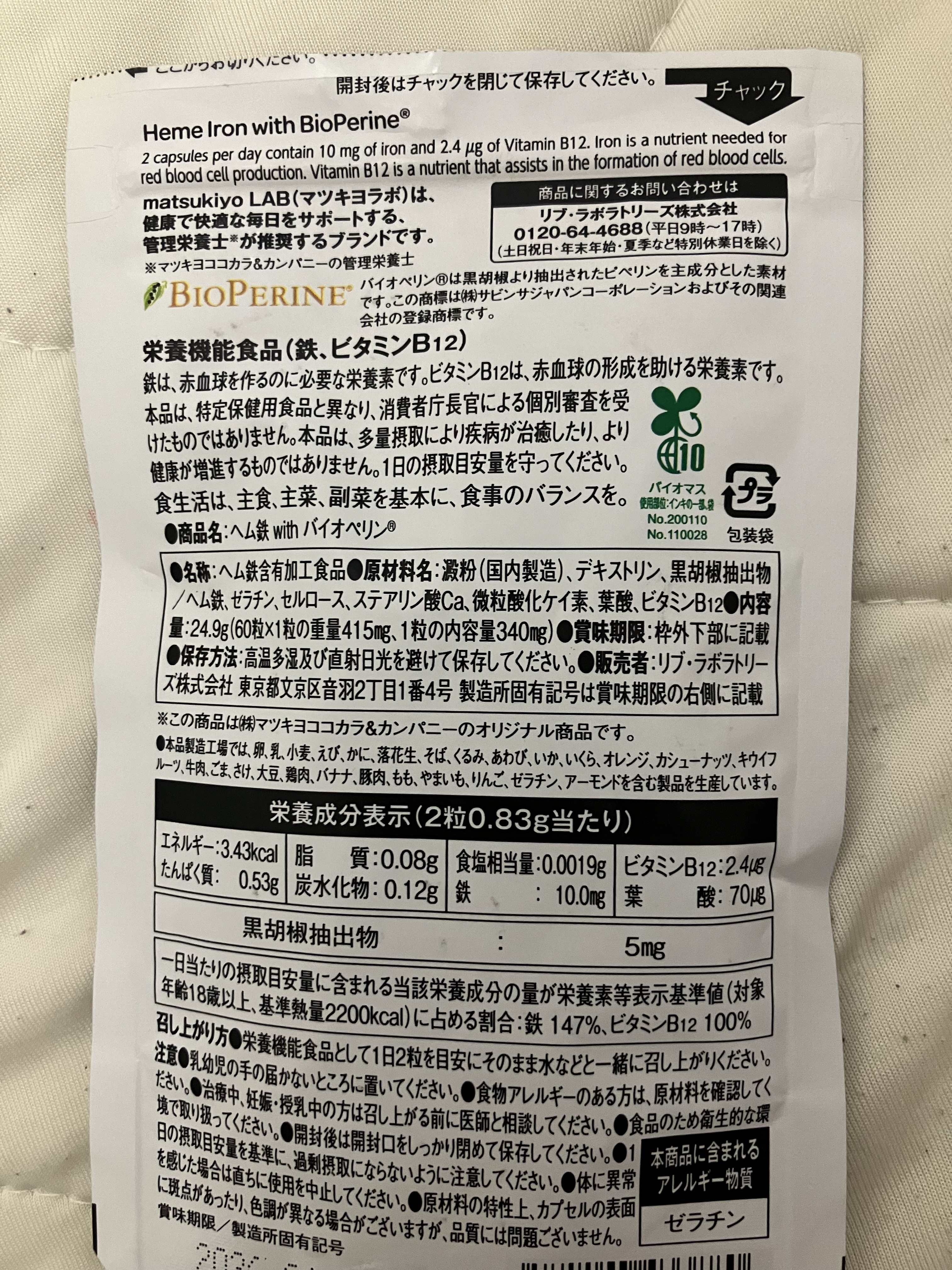 ❁.˚‧º‧‧º·˚.❁ 美容と健康維持に 不可欠な存在❁.˚‧º‧‧º·˚.❁matsukiyoヘム鉄withバイオペリンを買ったよ◡̈✩*˚₊‧ੈ✩おすすめポイントੈ✩‧₊˚*⋆1日2粒鉄・・・10.0mgビタミンB12・・・2...