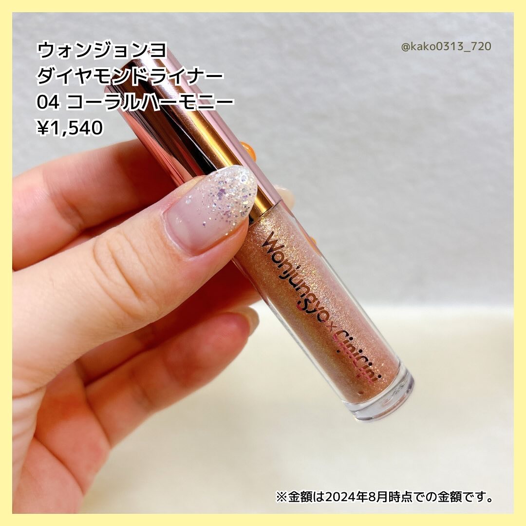 ウォンジョンヨの大人気ラメライナーの限定色が定番化されるので紹介していきます! 04 コーラルハーモニーは微細パール配合の肌馴染みが良いの温かみのあるコーラルカラー。 斜めカット平筆は狙ったところにラメをのせやすくて◎