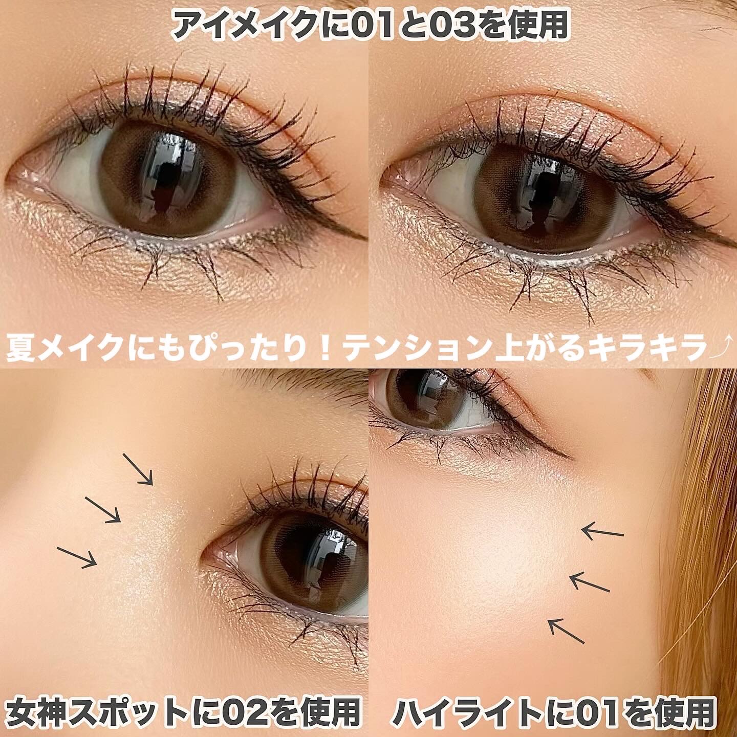 カラーは全体的にもっと淡めかなー?と思っていましたが、わりと締めがしっかりした発色でナチュラルにもはっきりにもできそうです◎ 粉質はふわっとしているけど保湿成分にスクワラン・ホホバ種子油配合でしっとりさもあって密着感も良かったです🙆🏼♀️ ただラメは少し飛びそうな感じがしたので下地や指付けと工夫してメイクしたいな🤤
