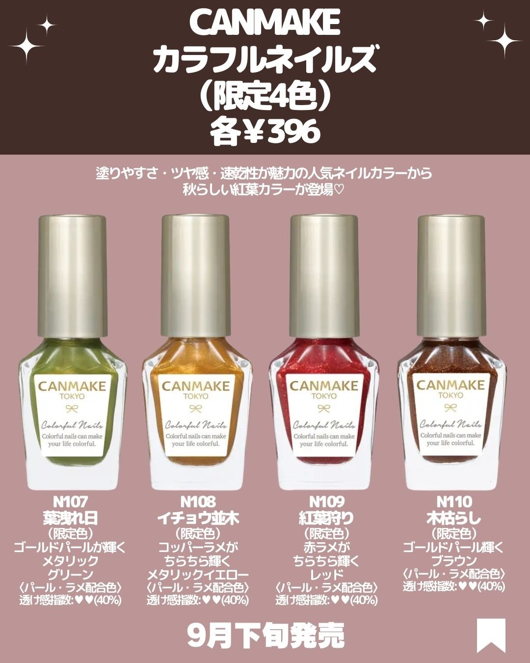 大人気カラフルネイルズ新作速報💛 9月下旬より限定発売されるのでお見逃し無く〜👀 『紅葉』がテーマの4色が登場!🍁 4色ともにたっぷりならきらきらラメ入りなので華やかでオシャレな印象に💛 ひと塗りでも高発色なのでお出かけ前にさくっとネイルを塗れちゃいます💅