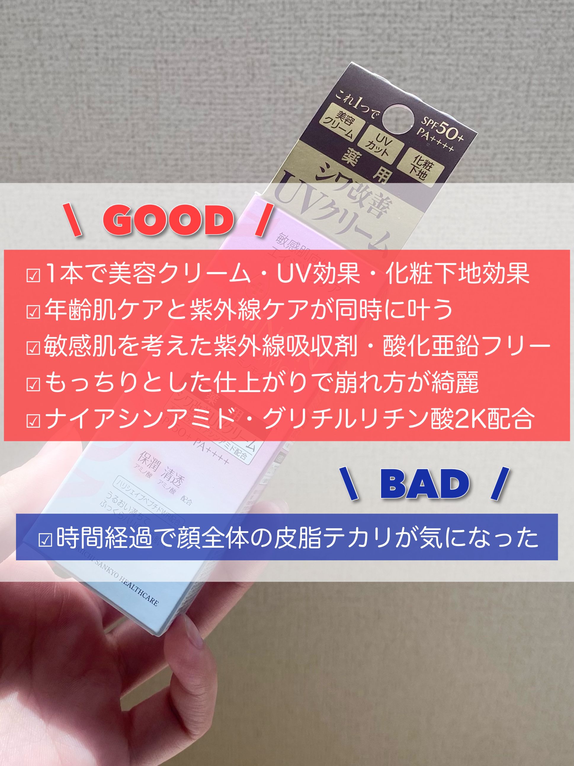 SPF50+ PA++++のUVカットと低刺激性処方の両立を実現した化粧下地。 シワ改善もできるUVクリーム、誕生。1本3役 美容クリーム、UVカット、化粧下地 しっとりベタつかない使用感は、次のファンデの邪魔にならず使いやすい!