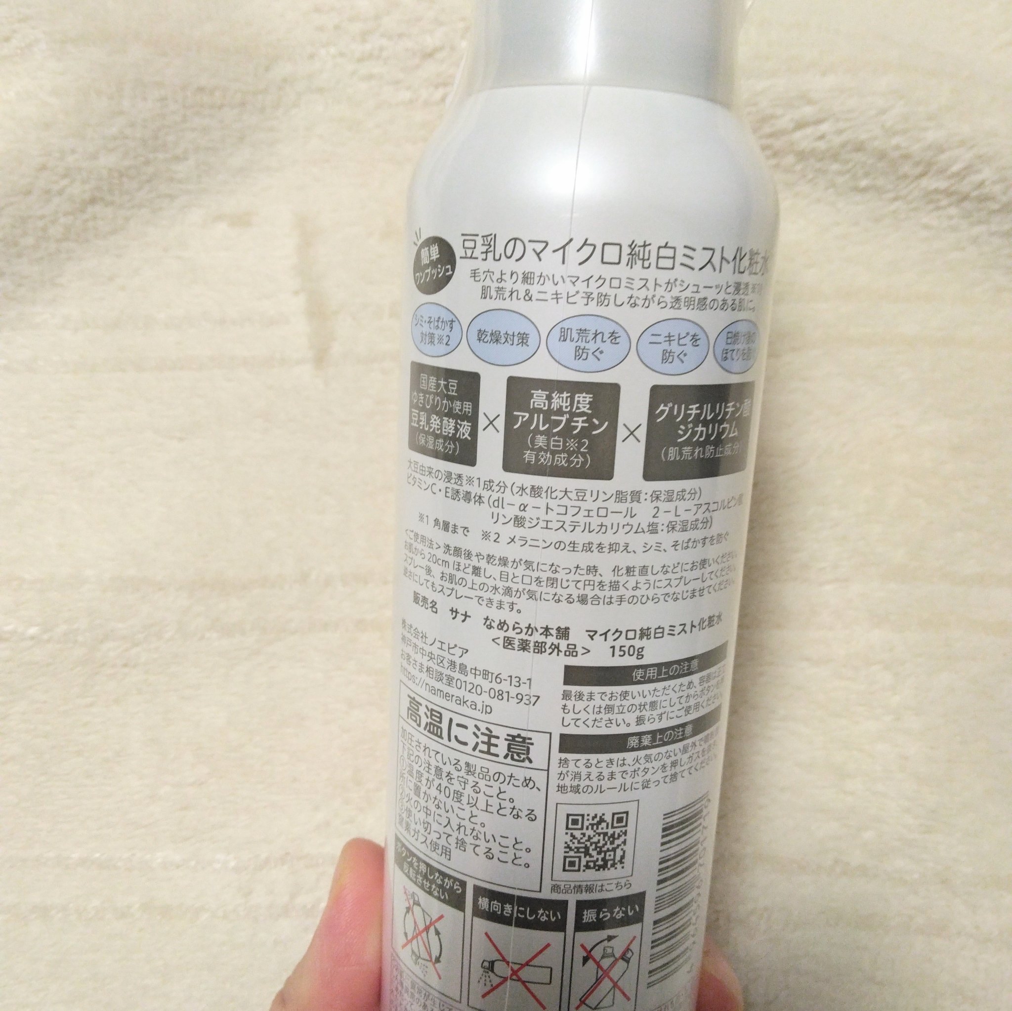 - 【医薬部外品】 ① 肌荒れ・ニキビ予防・美白*2 北海道産大豆「ゆきぴりか」を使用した豆乳発酵液※1 に加え、美白*2 有効成分アルブチン、ニキビ・肌荒れ防止有効成分※3 配合でお肌にうるおいと透明感を与えます。 ② 超微細ミストで導入ケア 毛穴より細かく、肌あたりの良いマイクロミストが角層まで浸透し、うるおいのあるお肌に導きます。 大豆由来の浸透※4成分※5がお肌に必要な油分と水分の両方を引き付けながらうるおいを補給! 化粧水やオールインワンジェルの前の使用がおすすめです。 ③ 全身にもより使いやすく! 倒立(逆さ)での使用も可能になり、背中など全身にも、よりお使いいただきやすくなりました。 ④ こだわりの処方 無香料、無着色、無鉱物油のこだわりの処方。 *2 メラニンの生成を抑え、シミ・そばかすを防ぐ ※1 保湿成分 ※2 セラミドNG(保湿成分) ※3 グリチルリチン酸ジカリウム ※4 角層まで ※5 水酸化レシチン(保湿成分)
