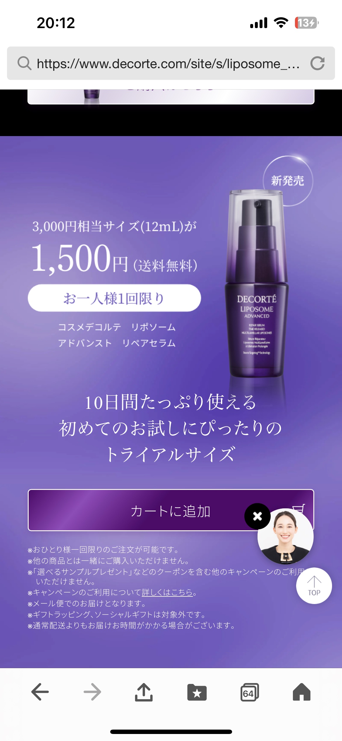 DECORTÉリポソームアドバンスト リペアセラムトライアルサイズ12ml¥1,500公式サイトにて¥3,500相当が¥1,500で購入できます。10日間分だそうです。私はワンプッシュで、夜だけの使用なので1ヶ月くらいで無くなりそうです。使用...