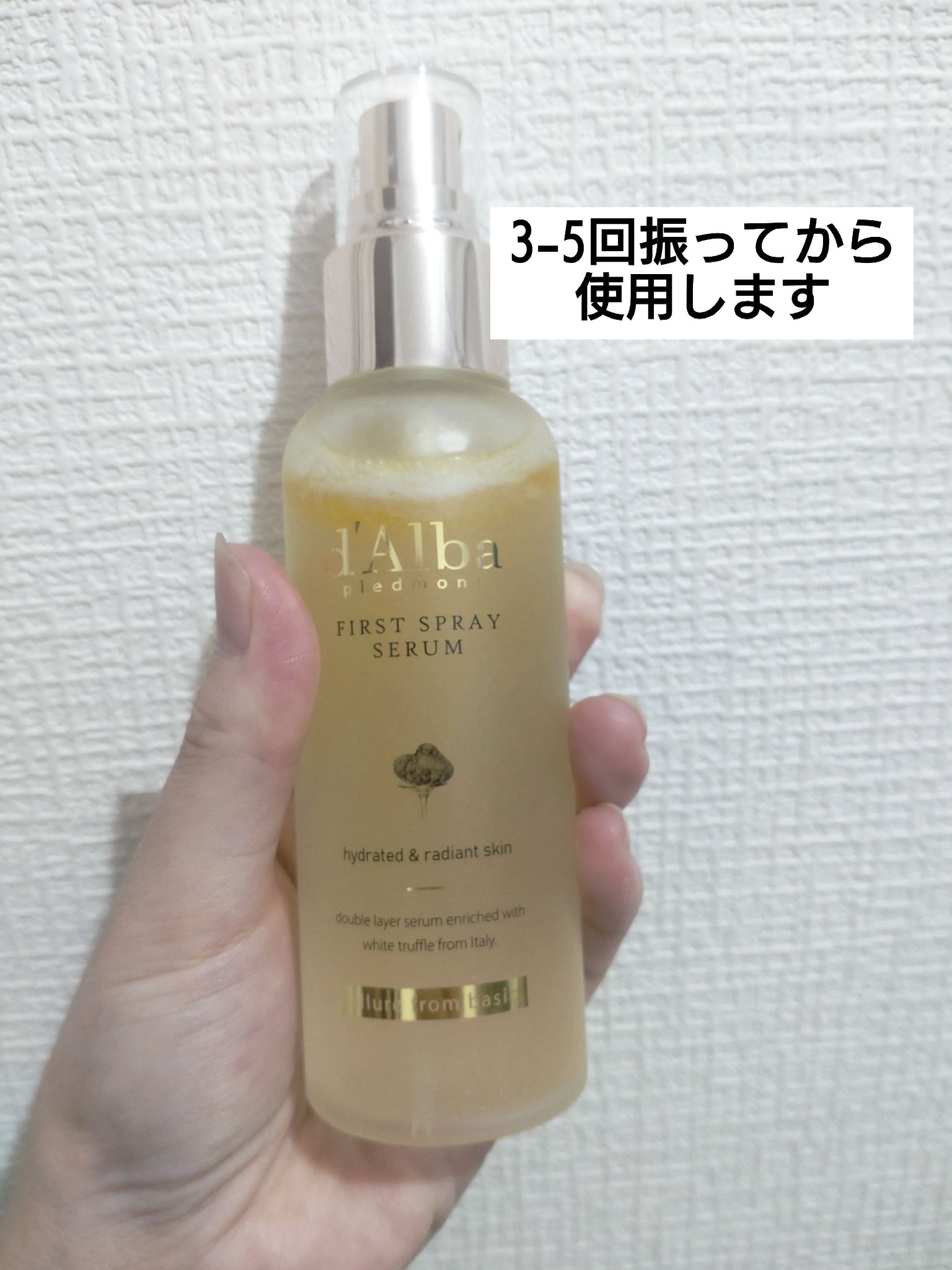 高級感のある透明のボトルからは中が2層になっているのがよく見えます。上の方が黄色く、下は透明です。 イタリア産ホワイトトリュフが入っているセラムです。オイルの層はボトルを振るとすぐに混ざります。 シュッシュッとお肌にかけてふんわりいい香りを楽しみます。とってもいい香りがするんですよ。