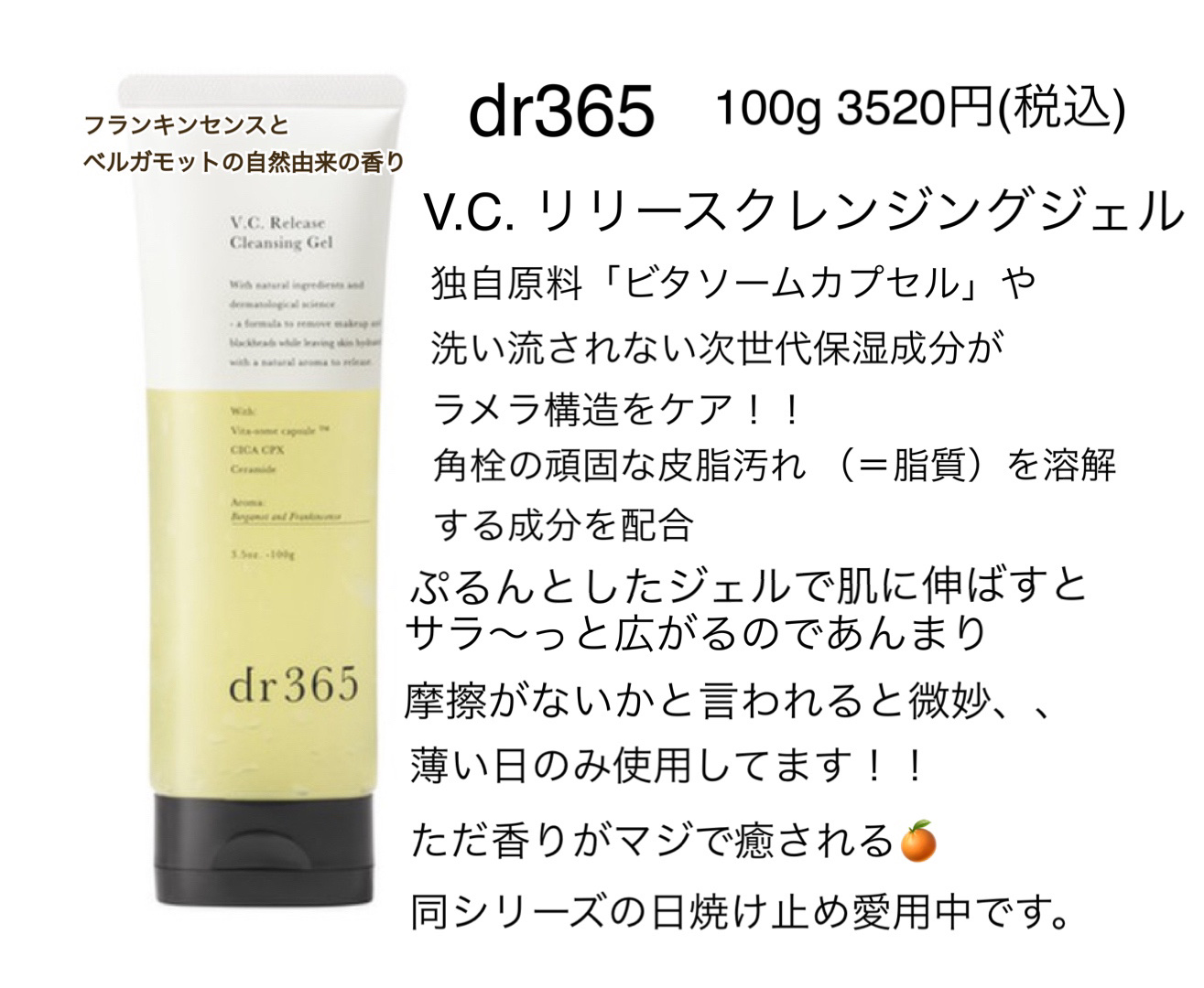 dr365V.C.リリースクレンジングジェル100g¥3,520手に取ってから肌に伸ばすために少し擦り合わせただけでジェルが水っぽくなって馴染ませやすいジューシー。クレンジングといえば何を使っても乳化させていたので、乳化いらず手間いらずは嬉し...