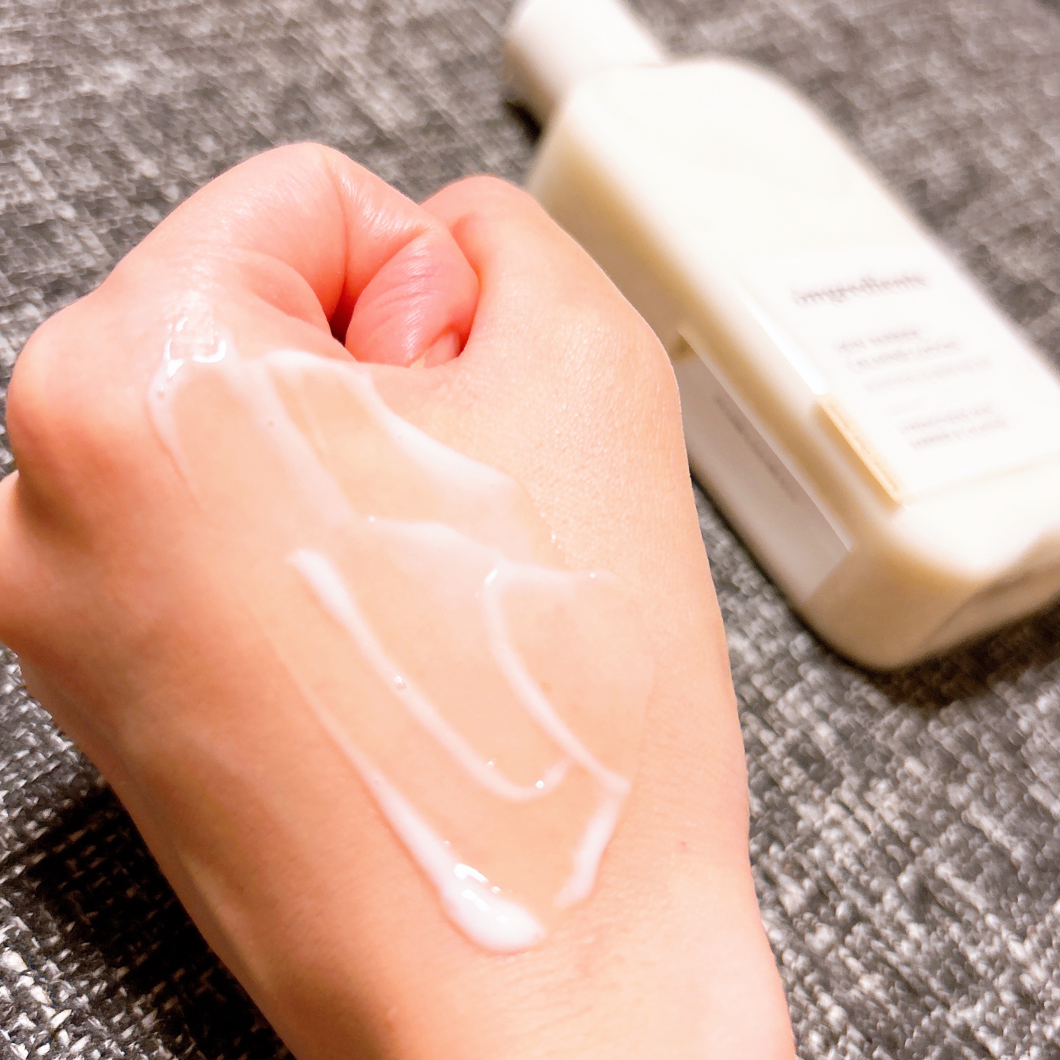 テクスチャーは滑らかで、とても伸びが良いです💕 本当に日焼け止め?と疑うほど、クリームのような心地よい使用感😌 きしむ感じやカサカサ感が全くなく、お肌に潤いを与えてくれる感覚に。 そしてお気に入りポイントは化粧下地としても使えること!日焼け止めと下地を両方塗らなくても良いのは便利ですよね✨ 白浮きしない程度に程よくトーンアップもしてくれるので、私はちょっとしたお出かけのときはファンデなしでこれひとつでベースを済ませちゃいます☺️ 肌負担かけずに時短でメイク完成できちゃうのがお気に入り💕