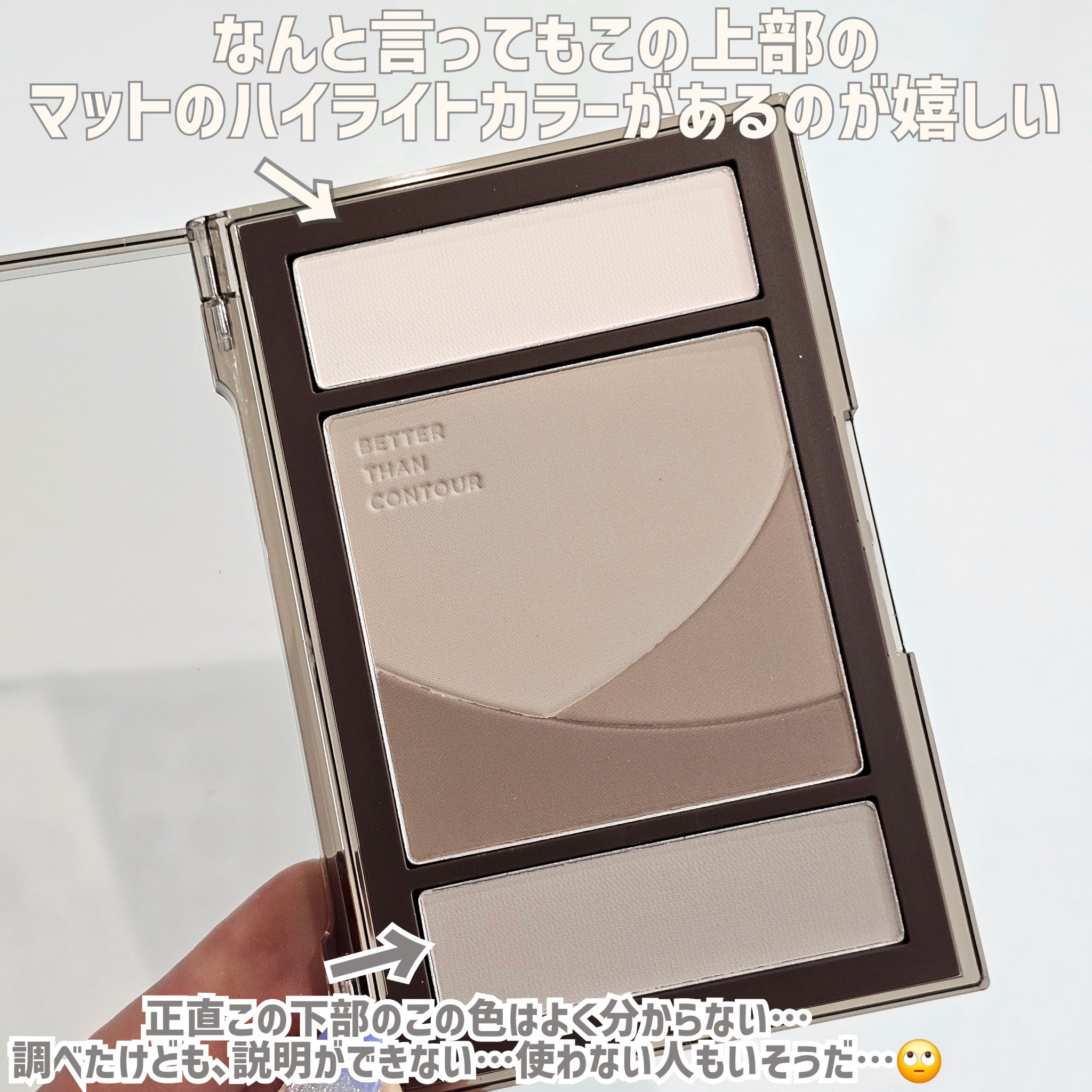 全体のローズ感と粉質もたまらなくいいんですが 左下のハイライトカラー?パールの粉が すんごい涙袋にいいんですよ… パーンとめちゃくちゃ涙袋盛れるけど、 ほんのりピンクがかった白みベージュなので 平成ギャルみたいになるわけではない…と思う ほんとこのハイライトカラーが涙袋に良すぎて いつかここだけ底見えする説…