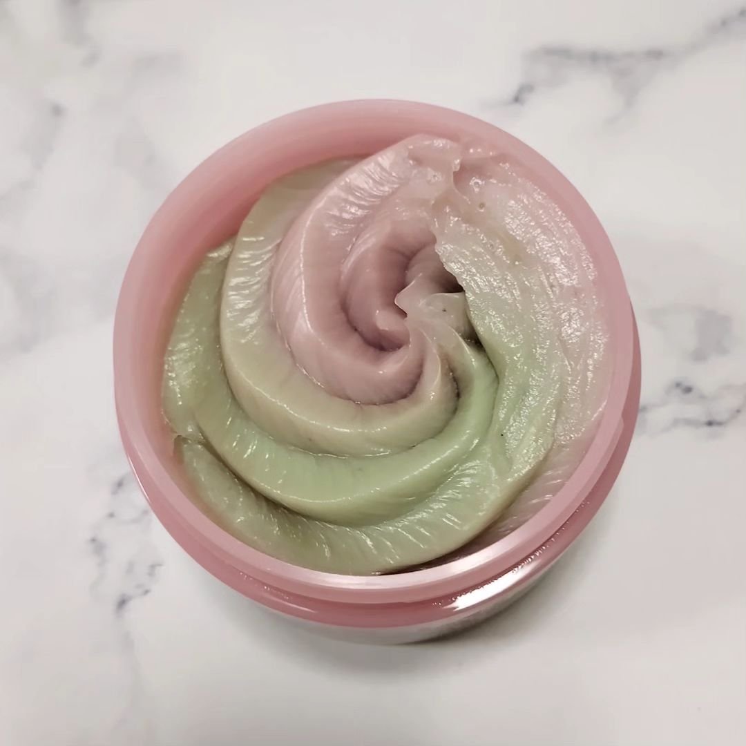 APRILSKINピンクアロエメレンゲクレンザー洗顔、パックにも使える新感覚2wayクレンザー🫧ピンクアロエや豆スクラブ、グリーンの部分はツボクサエキスや緑豆スクラブなどが配合されてるみたい🌿✨肌表面のザラつきを滑らかにしてくれて、汚れもスッ...