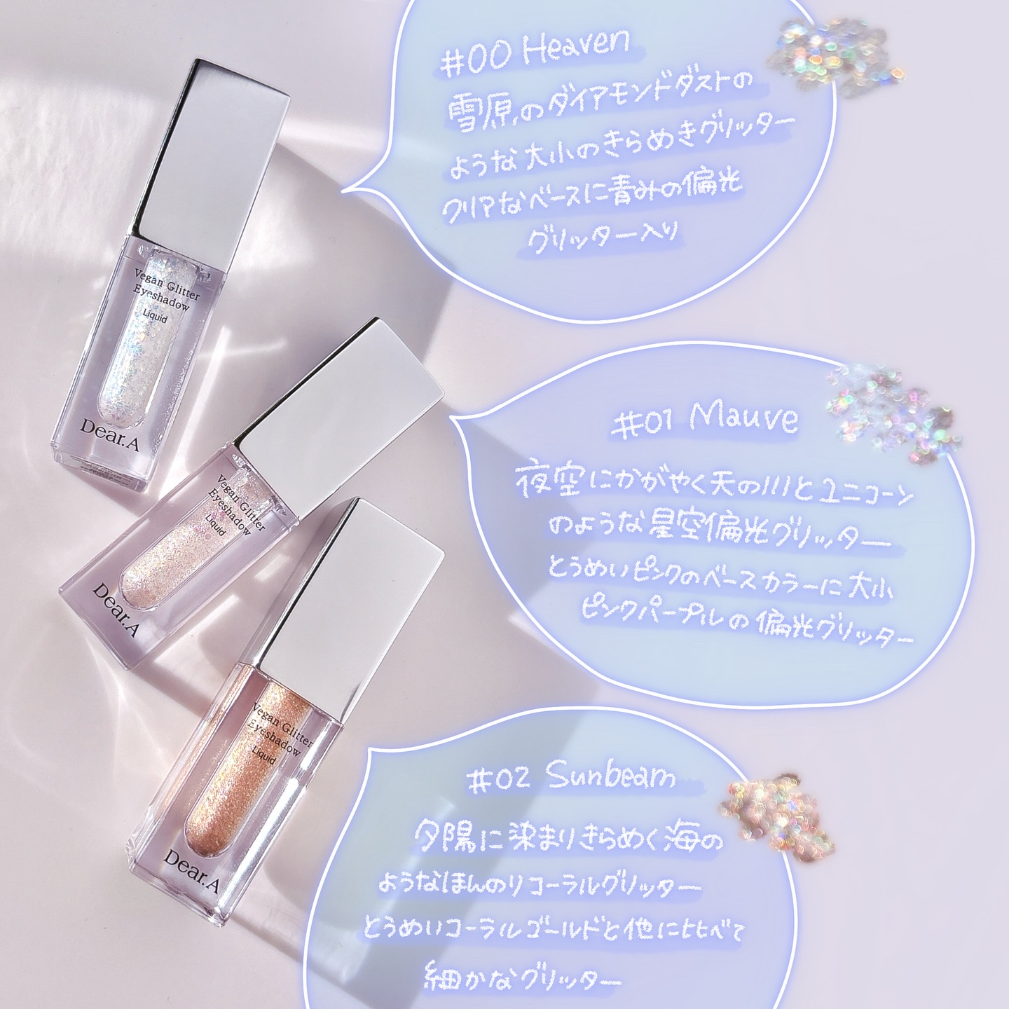 ⚪️Dear.A⚪️グリッターアイシャドウ00HEAVEN/01MAUVE/02SUNBEAM☪️密着ウォーターベースのうるキラアイシャドウ✨☪️ラメ飛びしづらい❕53%以上ウォーターベース💧▫️5つの美容成分配合▫️ダマスクローズエキス、ハ...