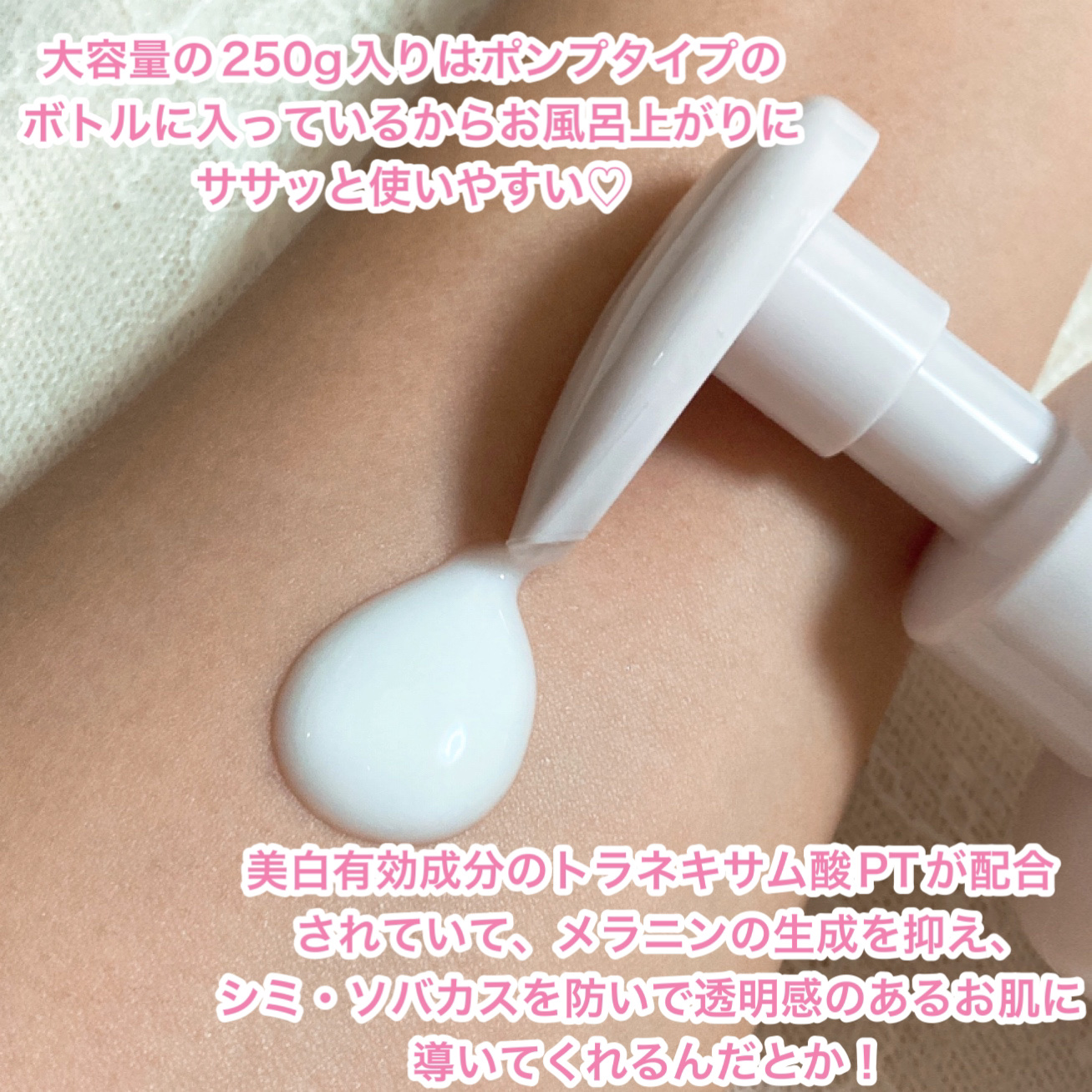- <150g> トラネキサム酸、精製水、BG、濃グリセリン、テトラエチルヘキサン酸ペンタエリスリチル、ラウロイルグルタミン酸ジ(フィトステリル・オクチルドデシル)、ペンチレングリコール、ジグリセリン、植物性スクワラン、トリエチルヘキサン酸グリセリル、α-オレフィンオリゴマー、ステアリン酸ポリグリセリル、D-パンテテインスルホン酸Ca液、アセチル化ヒアルロン酸ナトリウム、加水分解黒豆エキス、ローヤルゼリーエキス、ゼニアオイエキス、ヒアルロン酸Na-2、ベヘニルアルコール、水添ナタネ油アルコール、ジリノール酸ジ(イソステアリル/フィトステリル)、ジメチコン、グリセリンエチルヘキシルエーテル、カルボキシビニルポリマー、キサンタンガム、アルカリゲネス産生多糖体、トリステアリン酸デカグリセリル、天然ビタミンE、d-δ-トコフェロール、水酸化K <250g> トラネキサム酸、精製水、BG、濃グリセリン、テトラエチルヘキサン酸ペンタエリスリチル、ラウロイルグルタミン酸ジ(フィトステリル・オクチルドデシル)、ペンチレングリコール、ジグリセリン、植物性スクワラン、トリエチルヘキサン酸グリセリル、α-オレフィンオリゴマー、ステアリン酸ポリグリセリル、D-パンテテインスルホン酸Ca液、アセチル化ヒアルロン酸ナトリウム、加水分解黒豆エキス、ローヤルゼリーエキス、ゼニアオイエキス、ヒアルロン酸Na-2、ベヘニルアルコール、水添ナタネ油アルコール、ジリノール酸ジ(イソステアリル/フィトステリル)、ジメチコン、グリセリンエチルヘキシルエーテル、カルボキシビニルポリマー、キサンタンガム、アルカリゲネス産生多糖体、トリステアリン酸デカグリセリル、天然ビタミンE、d-δ-トコフェロール、水酸化K <『シナモロール』限定デザイン(250g)> トラネキサム酸、精製水、BG、濃グリセリン、テトラエチルヘキサン酸ペンタエリスリチル、ラウロイルグルタミン酸ジ(フィトステリル・オクチルドデシル)、ペンチレングリコール、ジグリセリン、植物性スクワラン、トリエチルヘキサン酸グリセリル、α-オレフィンオリゴマー、ステアリン酸ポリグリセリル、D-パンテテインスルホン酸Ca液、アセチル化ヒアルロン酸ナトリウム、加水分解黒豆エキス、ローヤルゼリーエキス、ゼニアオイエキス、ヒアルロン酸Na-2、ベヘニルアルコール、水添ナタネ油アルコール、ジリノール酸ジ(イソステアリル/フィトステリル)、ジメチコン、グリセリンエチルヘキシルエーテル、カルボキシビニルポリマー、キサンタンガム、アルカリゲネス産生多糖体、トリステアリン酸デカグリセリル、天然ビタミンE、d-δ-トコフェロール、水酸化K