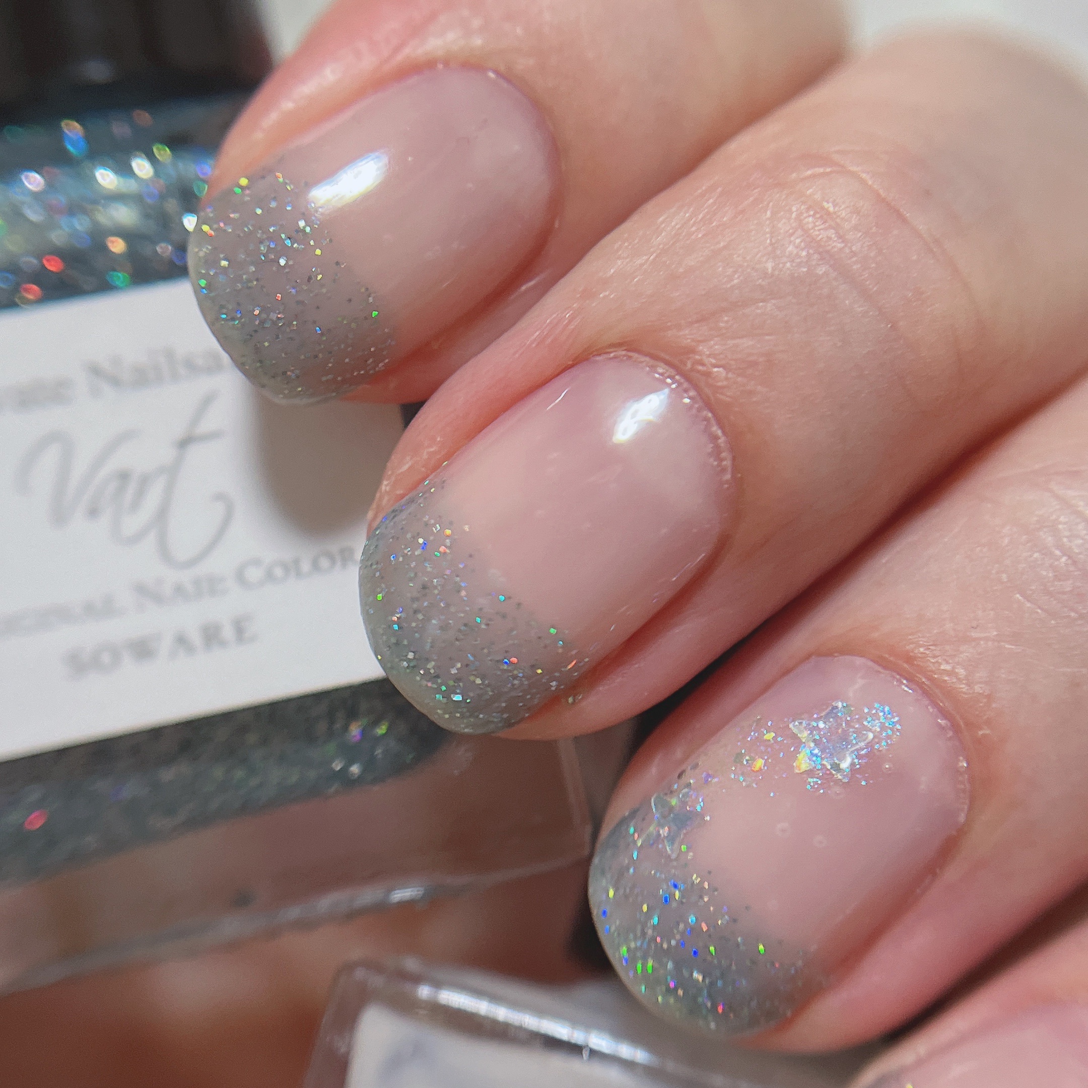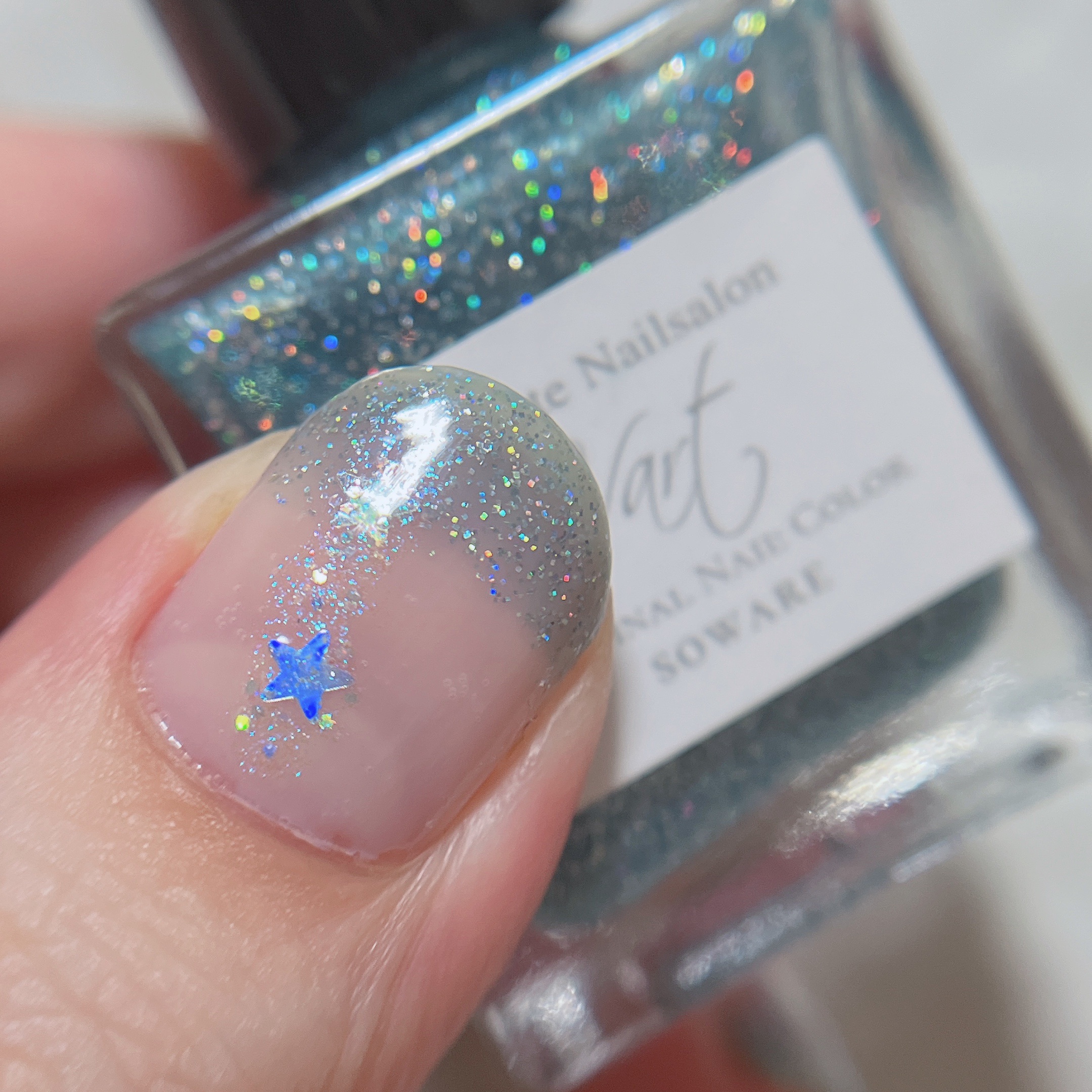 やってみたかった水色×ラメ×ホワイト✨ MINAWA2度塗り(乾かす)+SHIRAHAE1度塗り 思った以上にMINAWAが薄づきで、 2度塗りしても爪の白い部分が透けてた…(笑) ラテネイルしてみたけど MINAWAとSHIRAHAE の発色が違いすぎて