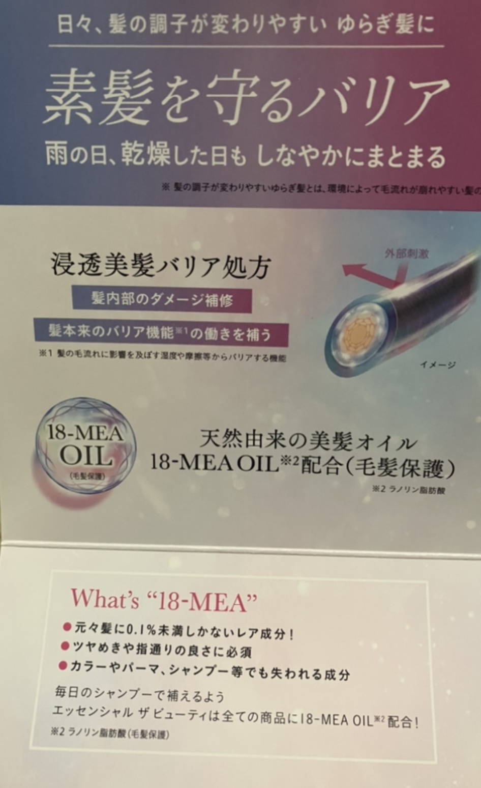 泡立ちは、とっても良かったです 香りは、他のエッセンシャルのシャンプーよりも穏やかでした 素髪を守るバリアシャンプー。雨の日、乾燥した日もしなやかにまとまる。 天然由来の美髪オイル18ーMEA OIL配合 (毛髪保護)