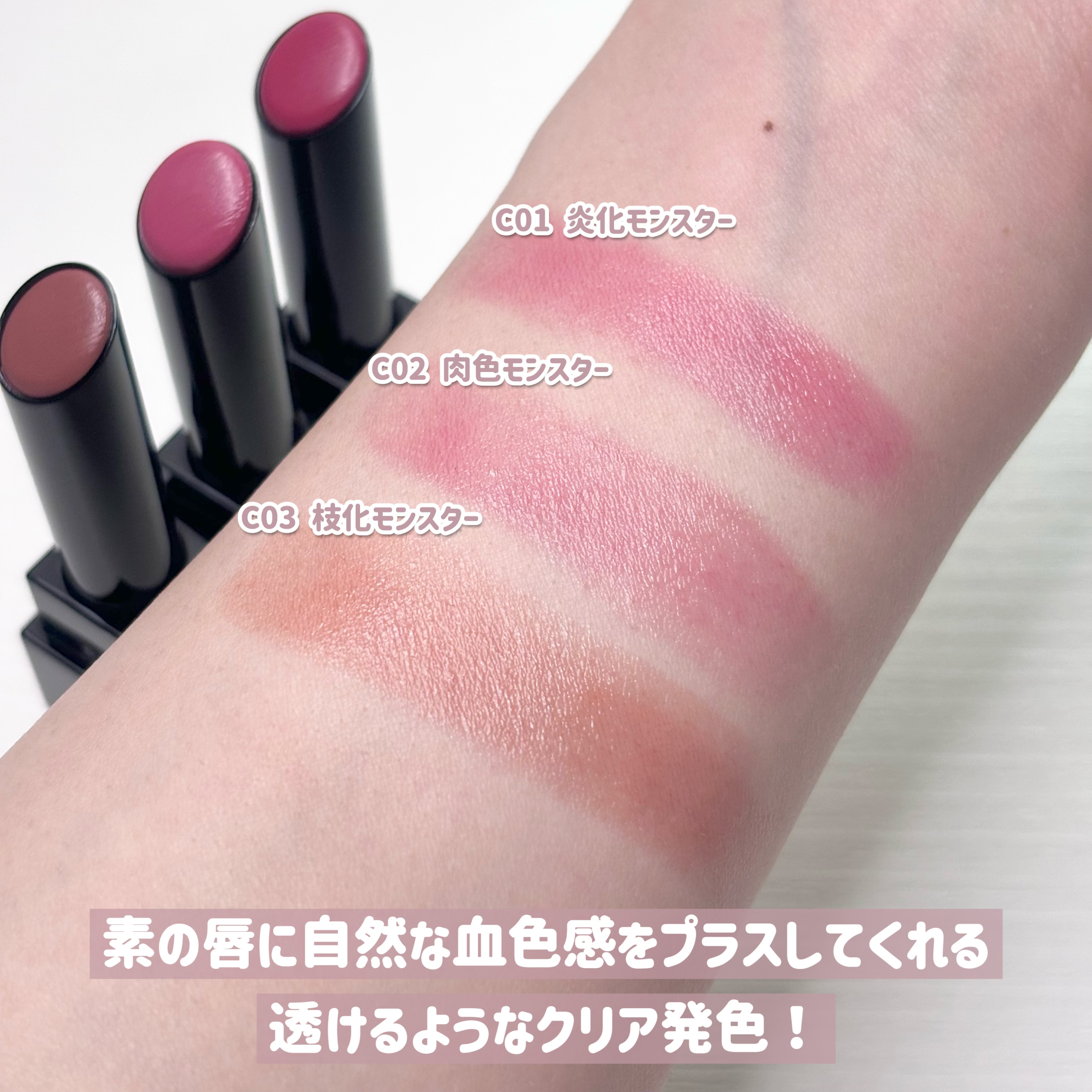 リプモンからシアーカラー#KATEリップモンスタークリアトーン✔︎C01炎化モンスター✔︎C02肉色モンスター✔︎C03枝化モンスター¥1,320円(税込)7/20発売!リプモンの色持ちはそのままになじみ発色のクリアカラーが登場〜!くすみは補...