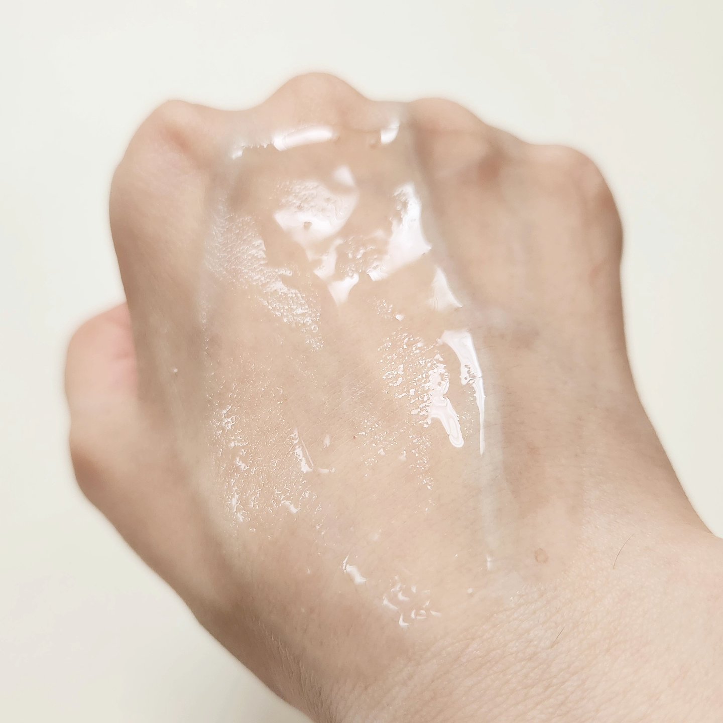 とってもみずみずしい! キャップは回して開けるタイプです。 写真2枚目:手の甲に出していますが、本当にみずみずしいテクスチャーでスーッと伸びます。 香りがあり、『優しいほのかなフローラルアロマの香り』とありますが、ホワイトフローラルという感じの、清潔感のあるやさしい香りがします。