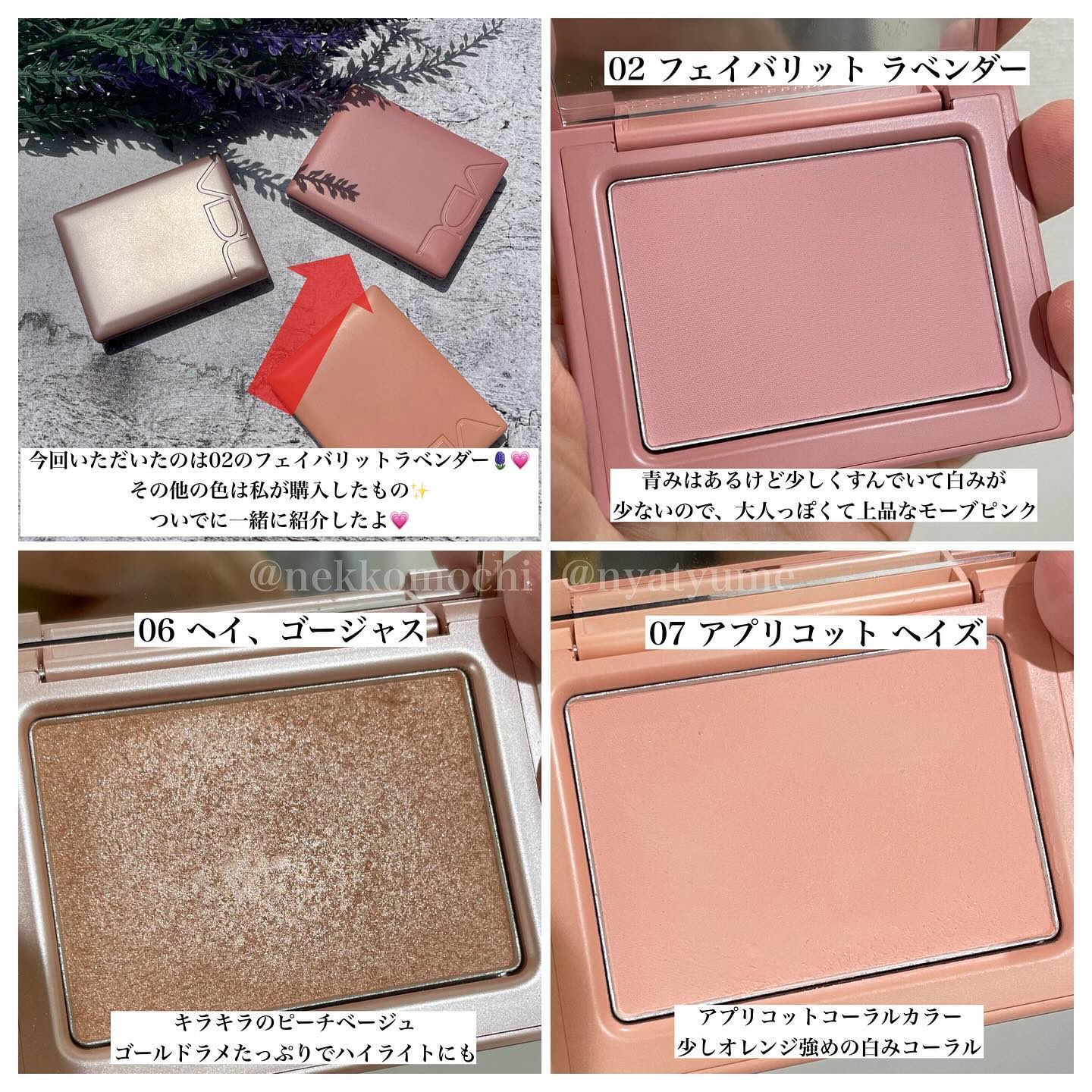 - <02 フェイバリット ラベンダー> タルク、(フッ化/水酸化/酸化)/(Mg/K/ケイ素)、マイカ、ナイロン-12、シリカ、ラウリン酸ヘキシル、ミリスチン酸Mg、リンゴ酸ジイソステアリル、フェニルトリメチコン、(ビニルジメチコン/メチコンシルセスキオキサン)クロスポリマー、ヘキサ(ヒドロキシステアリン酸/ステアリン酸/ロジン酸)ジペンタエリスリチル、ステアロイルオキシステアリン酸オクチルドデシル、ジメチコン、フェノキシエタノール、エチルヘキシルグリセリン、ミリスチン酸Al、トリエトキシカプリリルシラン、ネオペンタン酸イソステアリル、カプリル酸グリセリル、ハイドロゲンジメチコン、水、(+/-)酸化チタン、酸化鉄、カルミン <03 ライク ベージュ> タルク、マイカ、ナイロン-12、(フッ化/水酸化/酸化)/(Mg/K/ケイ素)、合成フルオロフロゴパイト、シリカ、ミリスチン酸Mg、ラウリン酸ヘキシル、リンゴ酸ジイソステアリル、フェニルトリメチコン、ヘキサ(ヒドロキシステアリン酸/ステアリン酸/ロジン酸)ジペンタエリスリチル、ステアロイルオキシステアリン酸オクチルドデシル、(ビニルジメチコン/メチコンシルセスキオキサン)クロスポリマー、ジメチコン、フェノキシエタノール、エチルヘキシルグリセリン、ミリスチン酸Al、ネオペンタン酸イソステアリル、トリエトキシカプリリルシラン、カプリル酸グリセリル、ハイドロゲンジメチコン、水、(+/-)酸化チタン、酸化鉄、カルミン、黄4、黄5 <06 ヘイ、ゴージャス> マイカ、ホウケイ酸(Ca/チタン)、ラウリン酸ヘキシル、タルク、リンゴ酸ジイソステアリル、オクテニルコハク酸デンプンAl、ミリスチン酸Mg、窒化ホウ素、ステアリン酸亜鉛、合成フルオロフロゴパイト、フェニルトリメチコン、ヘキサ(ヒドロキシステアリン酸/ステアリン酸/ロジン酸)ジペンタエリスリチル、フェノキシエタノール、エチルヘキシルグリセリン、カプリル酸グリセリル、酸化スズ、トリエトキシカプリリルシラン、ジメチコン、水、(+/-)酸化チタン、カルミン、酸化鉄、黄4、黄5 <07 アプリコット ヘイズ> タルク、マイカ、(フッ化/水酸化/酸化)/(Mg/K/ケイ素)、ナイロン-12、シリカ、ラウリン酸ヘキシル、ミリスチン酸Mg、リンゴ酸ジイソステアリル、フェニルトリメチコン、ヘキサ(ヒドロキシステアリン酸/ステアリン酸/ロジン酸)ジペンタエリスリチル、ステアロイルオキシステアリン酸オクチルドデシル、(ビニルジメチコン/メチコンシルセスキオキサン)クロスポリマー、ジメチコン、フェノキシエタノール、エチルヘキシルグリセリン、ネオペンタン酸イソステアリル、ミリスチン酸Al、トリエトキシカプリリルシラン、カプリル酸グリセリル、ハイドロゲンジメチコン、水、(+/-)酸化チタン、酸化鉄、カルミン、黄4、黄5 <08 モーブ ヘイズ> タルク、マイカ、(フッ化/水酸化/酸化)/(Mg/K/ケイ素)、ナイロン-12、シリカ、ラウリン酸ヘキシル、ミリスチン酸Mg、リンゴ酸ジイソステアリル、フェニルトリメチコン、ヘキサ(ヒドロキシステアリン酸/ステアリン酸/ロジン酸)ジペンタエリスリチル、ステアロイルオキシステアリン酸オクチルドデシル、(ビニルジメチコン/メチコンシルセスキオキサン)クロスポリマー、ジメチコン、フェノキシエタノール、カプリル酸グリセリル、ネオペンタン酸イソステアリル、ミリスチン酸Al、トリエトキシカプリリルシラン、ハイドロゲンジメチコン、(+/-)酸化チタン、酸化鉄、カルミン