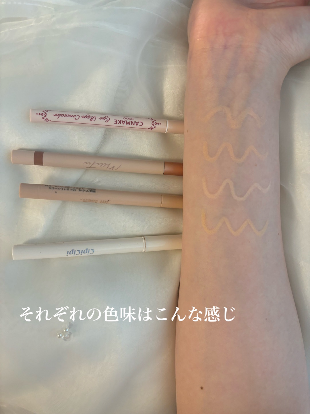 肌なじみのいいベージュカラー この中で1番ナチュラル 元々涙袋ある人みたいな仕上がり ほんのりピンクベージュカラー この中で1番ぷっくり感出る どんなメイクにも合わせやすい 女の子っぽいちごみるくカラー この中で1番発色が強め しっかり盛りたい人向け