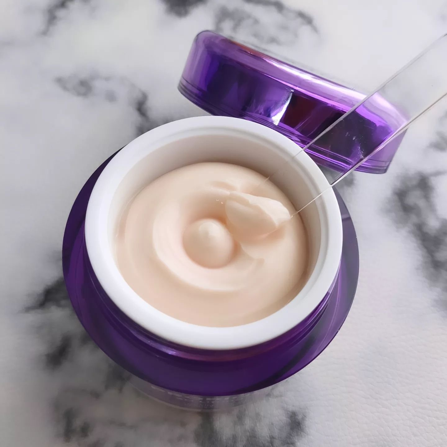 プロバイオダーム™ 3Dリフティングクリームがパワーアップ 乳酸菌飲料のような色味。テクスチャはこっくり濃厚なクリーム✨ 付属スパチュラがついてるのですくって塗布できて衛生的に使い続けられる(* 'ᵕ' )☆ コラーゲンとプロバイオダーム™ 配合でゆるんだ毛穴をケアして毛穴の目立ちを抑えるそう。