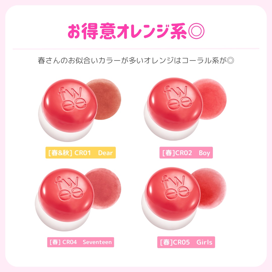 - <CR01 ディア> ダイメジメチコン、(ジメチコン/ビニルジメチコン)クロスポリマー、トリベヘニン、トリイソステアリン酸ポリグリセリル-2、リンゴ酸ジイソステアリル、合成フルオロフロゴパイト、二酸化チタン(CI 77891)、黄色酸化鉄(CI 77492)、カカオシードバター、ブルーアガベ葉エキス、セチルPEG/PPG-10/1ダイメチコン、イソステアリン酸ソルビタン、ビニルジメチコン/メチコンシルセスキオキサン)クロスポリマー、ポリヒドロキシステアリック酸、ジステアルジモニウムヘクトライト、パルミチン酸エチルヘキシル、ラウロイルサルコシン酸ナトリウム、アイソステアリック酸、レシチン、ジイソステアリン酸ポリグリセリル-2、ポリリシノレイン酸ポリグリセリル-3、クエン酸トリエチル、カプリリルグリコール、カプリル酸グリセリル、BG、精製水、香料、黄色5号(CI 15985)、赤色酸化鉄(CI 77491)、赤202(CI 15850)、黒色酸化鉄(CI 77499) <CR02 ボーイ> ダイメジメチコン、(ジメチコン/ビニルジメチコン)クロスポリマー、トリベヘニン、合成フルオロフロゴパイト、リンゴ酸ジイソステアリル、二酸化チタン(CI 77891)、トリイソステアリン酸ポリグリセリル-2、カカオシードバター、ブルーアガベ葉エキス、セチルPEG/PPG-10/1ダイメチコン、イソステアリン酸ソルビタン、ビニルジメチコン/メチコンシルセスキオキサン)クロスポリマー、ポリヒドロキシステアリック酸、ジステアルジモニウムヘクトライト、ジイソステアリン酸ポリグリセリル-2、パルミチン酸エチルヘキシル、ラウロイルサルコシン酸ナトリウム、アイソステアリック酸、レシチン、ポリリシノレイン酸ポリグリセリル-3、クエン酸トリエチル、カプリリルグリコール、カプリル酸グリセリル、BG、精製水、香料、黄色5号(CI 15985)、赤色104号(1) (CI 45410)、赤色酸化鉄(CI 77491)、赤202(CI 15850)、黄色4号(CI 19140) <CR03 ビーエフエフ> ダイメジメチコン、(ジメチコン/ビニルジメチコン)クロスポリマー、トリベヘニン、トリイソステアリン酸ポリグリセリル-2、リンゴ酸ジイソステアリル、合成フルオロフロゴパイト、二酸化チタン(CI 77891)、赤色104号(1) (CI 45410)、カカオシードバター、ブルーアガベ葉エキス、セチルPEG/PPG-10/1ダイメチコン、イソステアリン酸ソルビタン、ビニルジメチコン/メチコンシルセスキオキサン)クロスポリマー、ポリヒドロキシステアリック酸、ジイソステアリン酸ポリグリセリル-2、ジステアルジモニウムヘクトライト、パルミチン酸エチルヘキシル、ラウロイルサルコシン酸ナトリウム、アイソステアリック酸、レシチン、ポリリシノレイン酸ポリグリセリル-3、クエン酸トリエチル、カプリリルグリコール、カプリル酸グリセリル、BG、精製水、香料、黄色4号(CI 19140)、黄色酸化鉄(CI 77492)、赤202(CI 15850)、赤色201号 (CI 15850) <CR04 セブンティーン> ダイメジメチコン、(ジメチコン/ビニルジメチコン)クロスポリマー、トリベヘニン、リンゴ酸ジイソステアリル、トリイソステアリン酸ポリグリセリル-2、合成フルオロフロゴパイト、二酸化チタン、カカオシードバター、ブルーアガベ葉エキス、セチルPEG/PPG-10/1ダイメチコン、イソステアリン酸ソルビタン、ビニルジメチコン/メチコンシルセスキオキサン)クロスポリマー、ポリヒドロキシステアリック酸、ジステアルジモニウムヘクトライト、ジイソステアリン酸ポリグリセリル-2、パルミチン酸エチルヘキシル、ラウロイルサルコシン酸ナトリウム、アイソステアリック酸、レシチン、ポリリシノレイン酸ポリグリセリル-3、クエン酸トリエチル、カプリリルグリコール、カプリル酸グリセリル、BG、精製水、香料、赤色酸化鉄、赤色201号、黄色4号、赤色202号、黄色酸化鉄 <CR05 ガールズ> ダイメジメチコン、(ジメチコン/ビニルジメチコン)クロスポリマー、トリベヘニン、トリイソステアリン酸ポリグリセリル-2、合成フルオロフロゴパイト、黄色5号(CI 15985)、リンゴ酸ジイソステアリル、カカオシードバター、ブルーアガベ葉エキス、セチルPEG/PPG-10/1ダイメチコン、イソステアリン酸ソルビタン、ビニルジメチコン/メチコンシルセスキオキサン)クロスポリマー、ポリヒドロキシステアリック酸、ジイソステアリン酸ポリグリセリル-2、ジステアルジモニウムヘクトライト、パルミチン酸エチルヘキシル、ラウロイルサルコシン酸ナトリウム、アイソステアリック酸、レシチン、ポリリシノレイン酸ポリグリセリル-3、クエン酸トリエチル、カプリリルグリコール、カプリル酸グリセリル、BG、精製水、香料、黄色4号(CI 19140)、赤202(CI 15850)、二酸化チタン(CI 77891)、赤色201号 (CI 15850) <MV01 チリン> ダイメジメチコン、(ジメチコン/ビニルジメチコン)クロスポリマー、トリベヘニン、トリイソステアリン酸ポリグリセリル-2、リンゴ酸ジイソステアリル、合成フルオロフロゴパイト、酸化チタン (CI 77891)、赤色酸化鉄(CI 77491)、黄色酸化鉄(CI 77492)、カカオシードバター、ブルーアガベ葉エキス、セチルPEG/PPG-10/1ダイメチコン、イソス