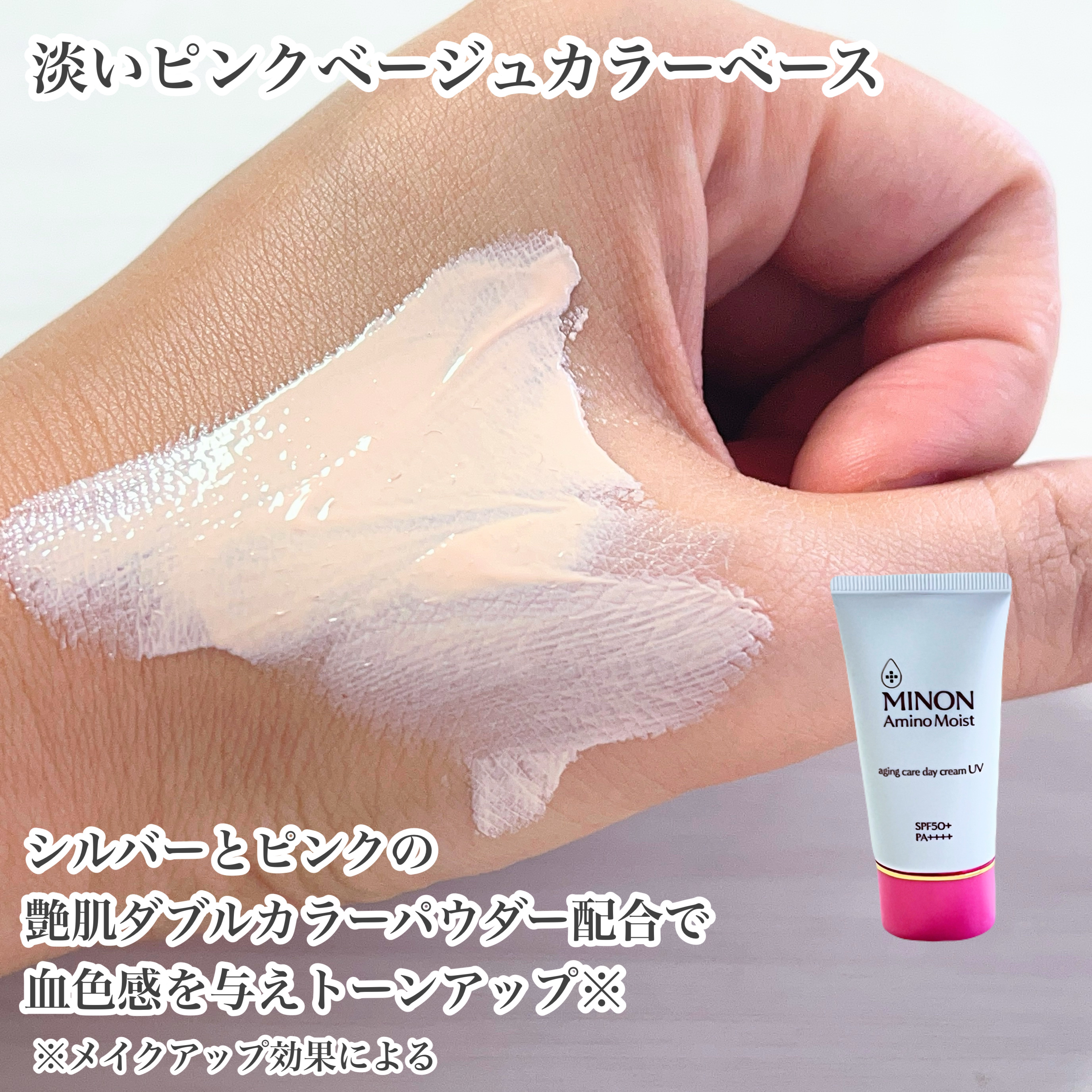 - 【シワ改善もできるUVクリーム】 SPF50+PA++++ シワ改善×UVカットが出来る薬用シワ改善UVクリーム。これ1本で美容クリーム・UVカット・化粧下地の3役。 シワ改善&しみ*予防成分「ナイアシンアミド」、肌あれ予防成分「グリチルリチン酸2K」配合。紫外線吸収剤&酸化亜鉛フリーで敏感肌を考えた処方。自然な輝きを放つ、やわらかなテクスチャーの化粧下地、見る角度で反射色が変わる「艶肌ダブルカラーパウダー」配合で自然な立体感を演出。 エイジングケア:年齢に応じたお手入れケア *メラニンの生成を抑え、しみ・そばかすを防ぐ (販売名:ミノンアミノモイストAU)【医薬部外品】
