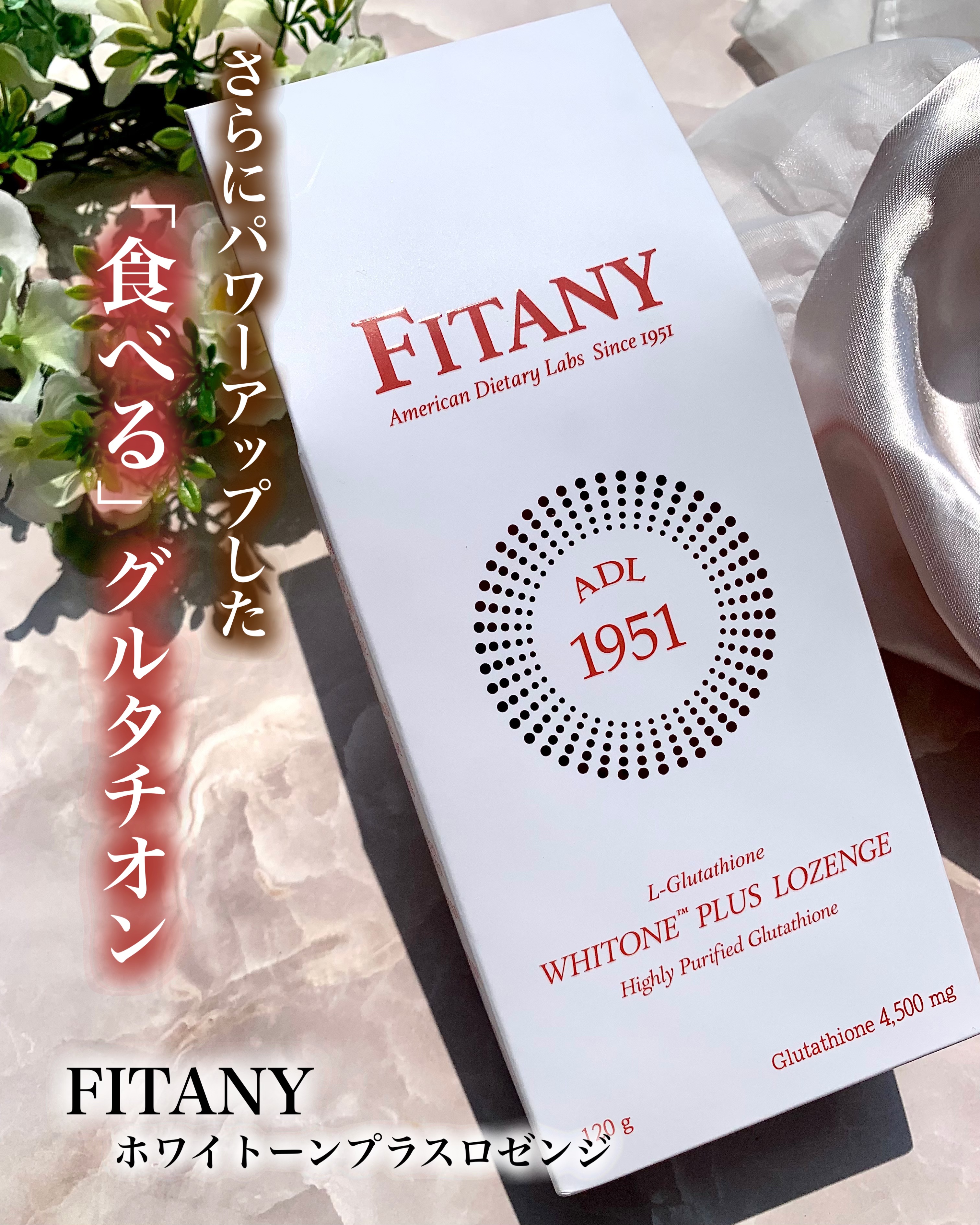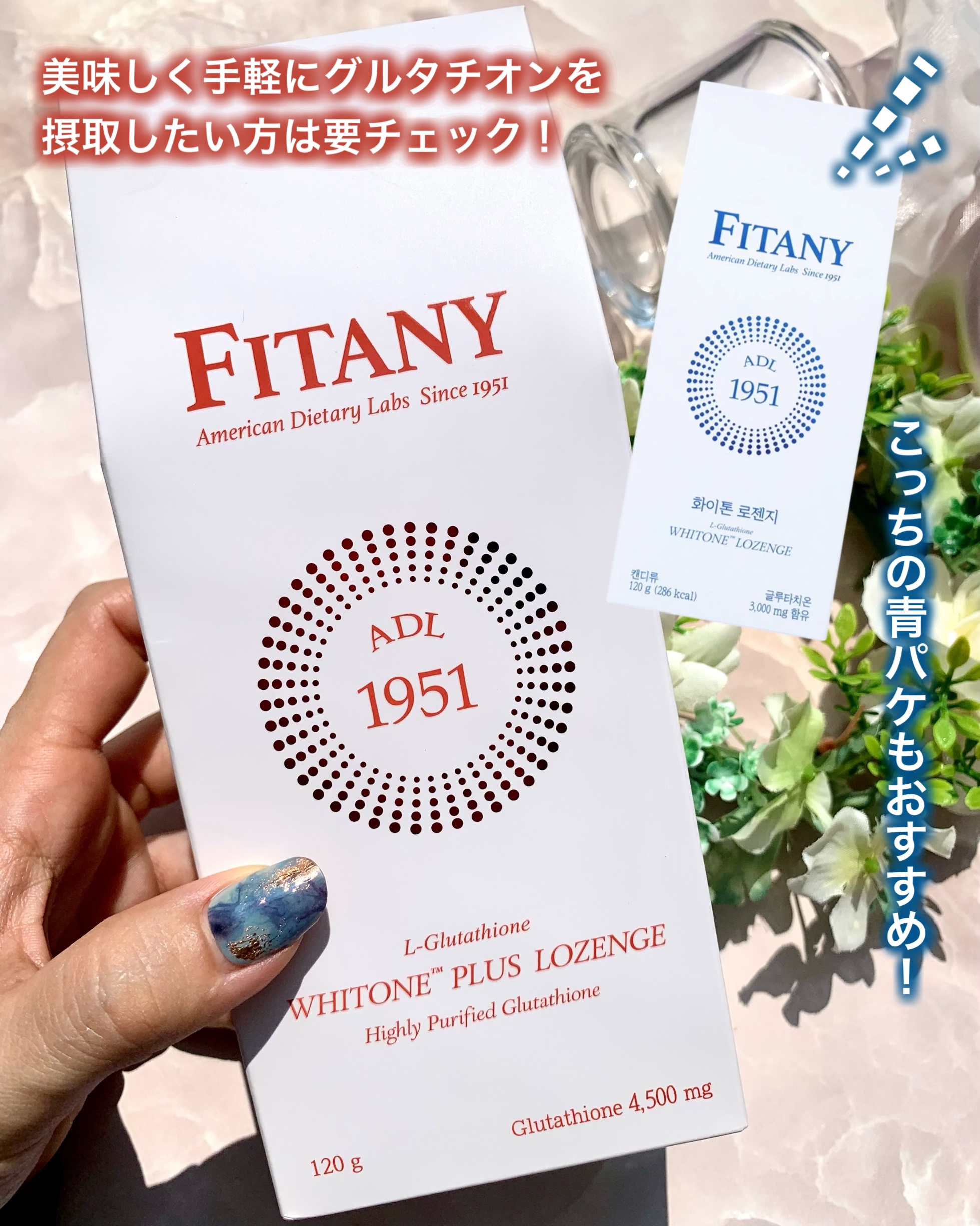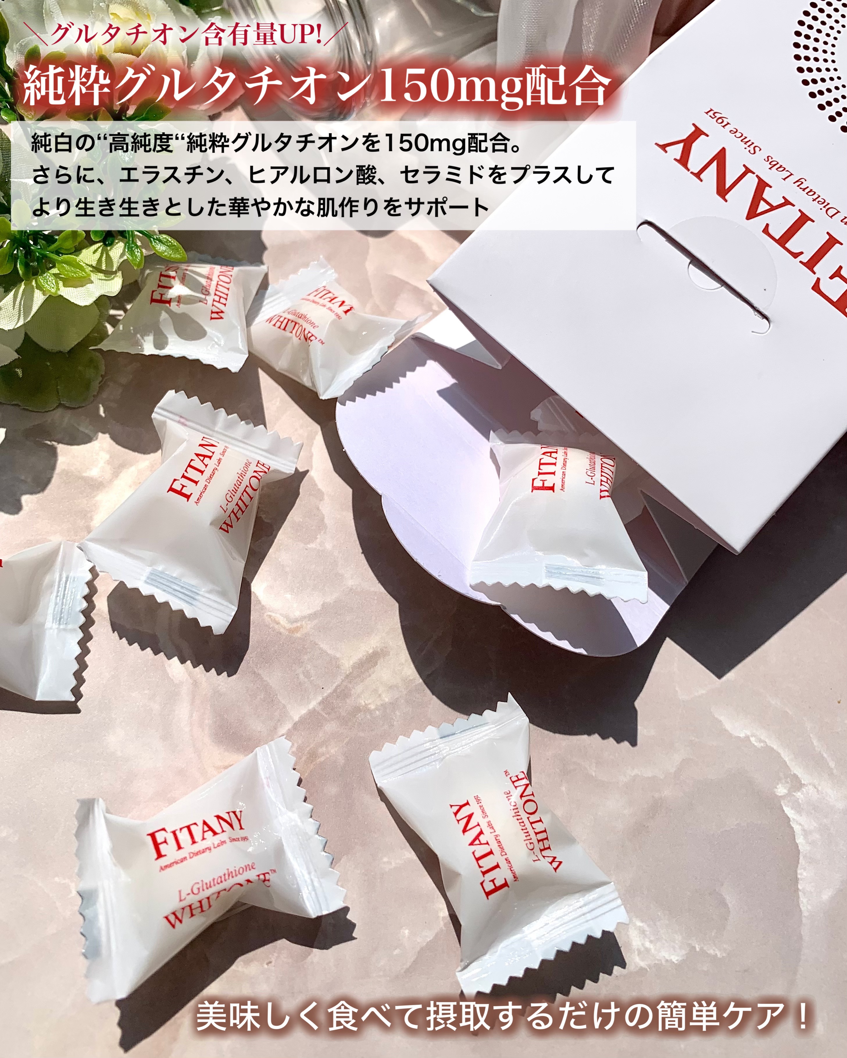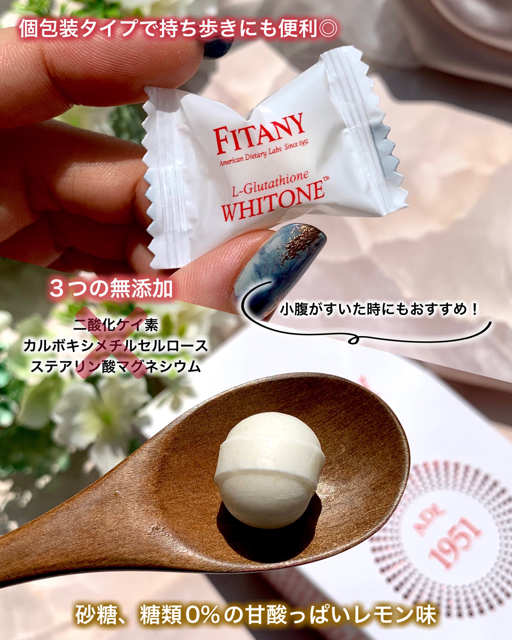 まるでキャンディー!舐めて溶かすだけ🍬 いつでも手軽においしくケア✨✨ 注目なのは、純粋グルタチオンが高含量なこと。1粒4gのところ、ホワイトーンロゼンジは、100mg ホワイトーンプラスロゼンジは、150mg 純粋グルタチオンを含有。 砂糖0%・糖類なしでも甘酸っぱい爽やかなレモン味で、お菓子感覚で摂取できちゃう。