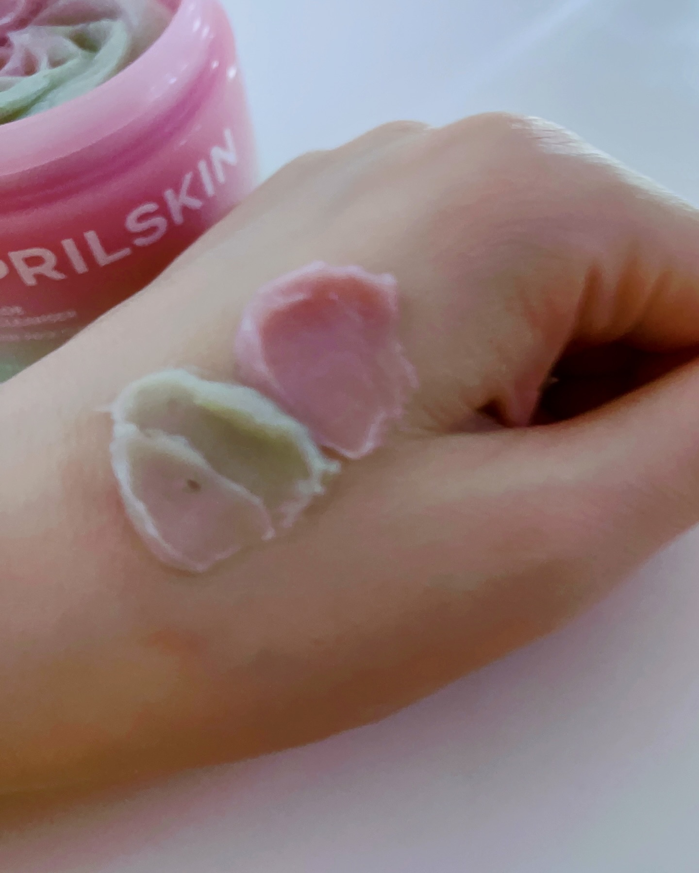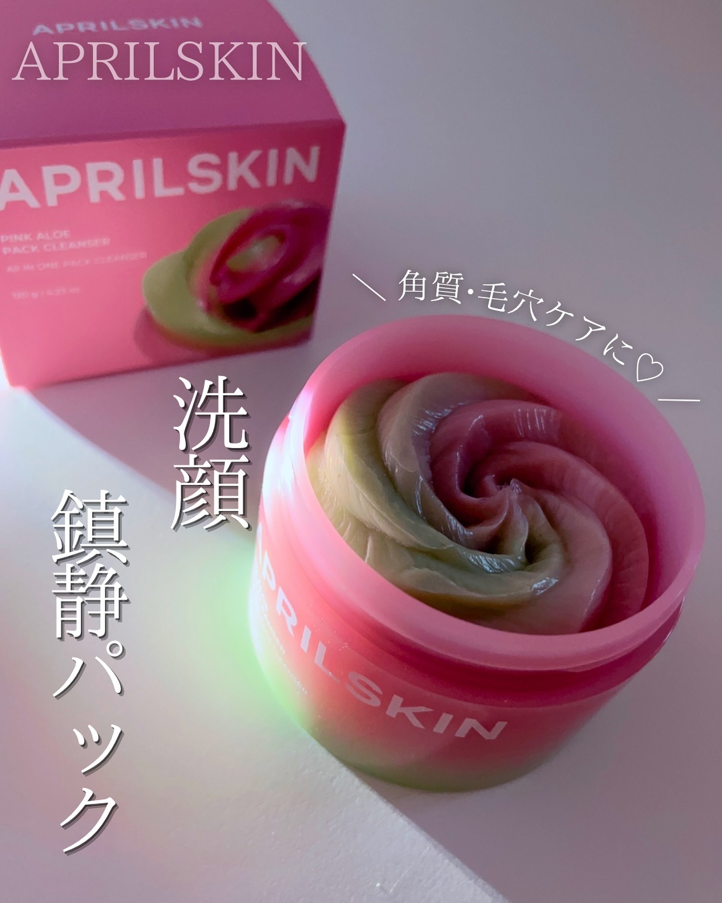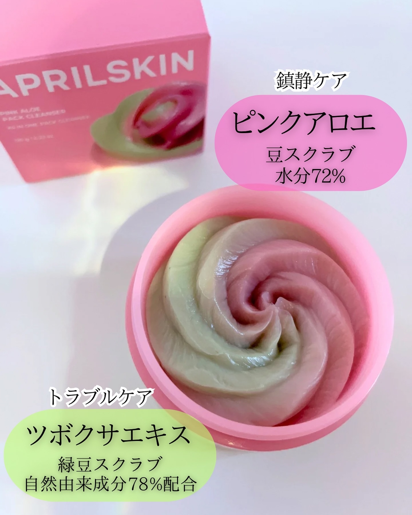 APRILSKINピンクアロエメレンゲクレンザー洗顔、パックにも使える新感覚2wayクレンザー🫧ピンクアロエや豆スクラブ、グリーンの部分はツボクサエキスや緑豆スクラブなどが配合されてるみたい🌿✨肌表面のザラつきを滑らかにしてくれて、汚れもスッ...