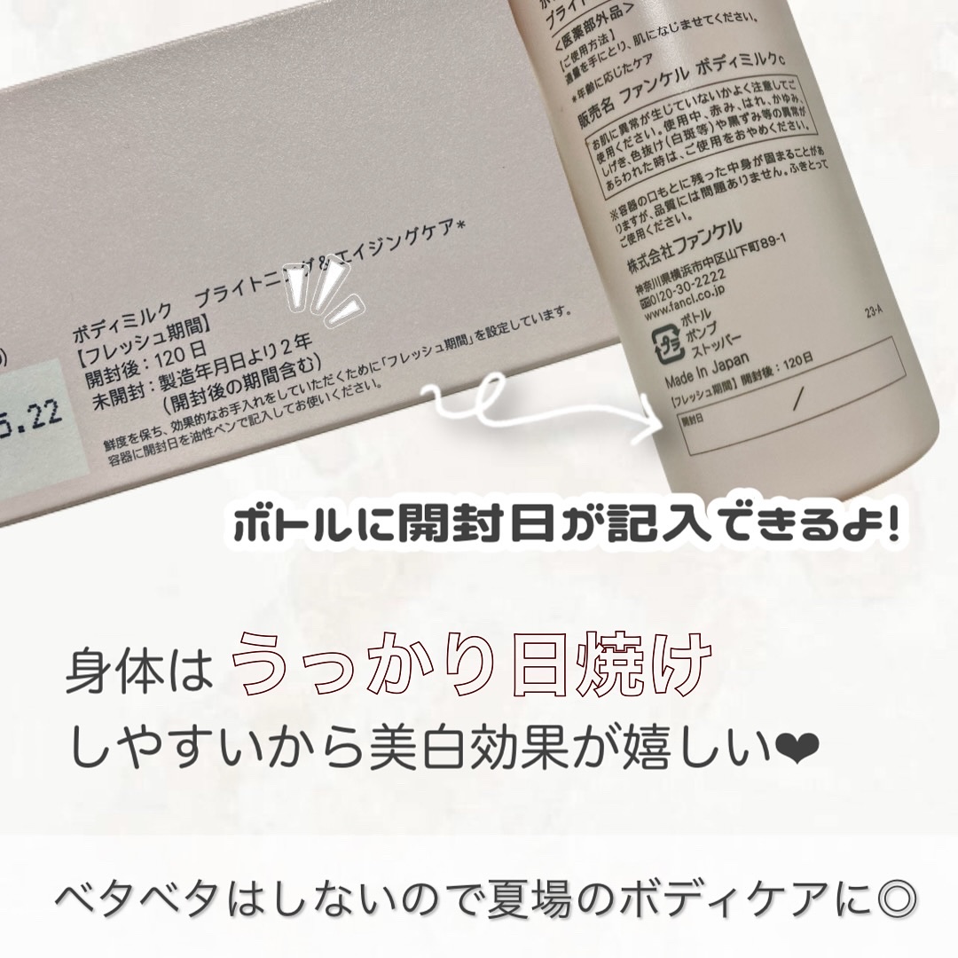 夏休みもそろそろ終わり☀️気づいたらうっかり日焼けしまくってました…日焼け止め塗ってても、ちょっとした時間でジワジワ焼けてるもんだ💦ということでボディの美白気合い入れます!ボディミルク塗るだけだけど美白、保湿、エイジングケアできるファンケルに...
