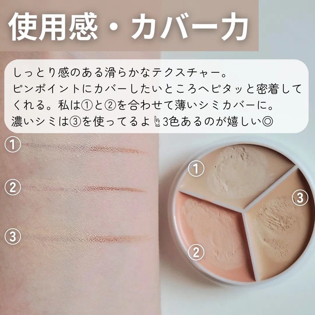- クマからニキビ跡、シミまでこれ1つでカバー。 3色タイプだからこそ、気になるところや肌色を選ばずにご使用いただけます。 リキッドタイプを圧縮した高濃度バームのため高カバー高密着*¹を実現。 コンシーラーだけでなくコントアとしても使用可能です。 *1メーカー比