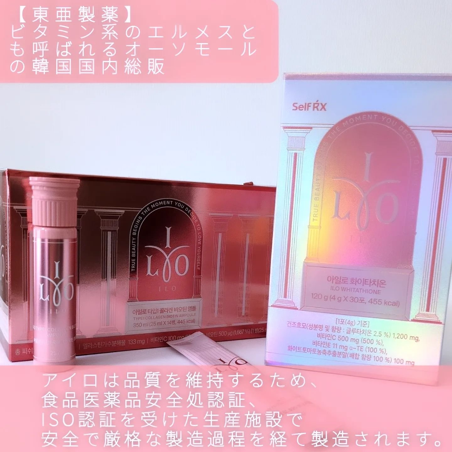 アイロホワイタチオン グルタチオン・ビタミンC・ビタミンEとホワイトトマトが配合された飲む日焼け止め💖 ホワイトトマトとはフィトエン&フィトフルエン含有量を豊富に配合しており、一般のトマトの5倍紫外線対策が出来る凄いトマトで、抗酸化・メラニン合成を抑制して肌のトーンをトーンアップしてくれるみたい💡 2024年7月オリーブヤング全体ランキング1位を獲得した飲むコラーゲン。I型コラーゲンは真皮の90%を構成するコラーゲンでアイロタイプⅠコラーゲンビオチンアンプルにはⅠ型コラーゲンが3000mgも配合😳