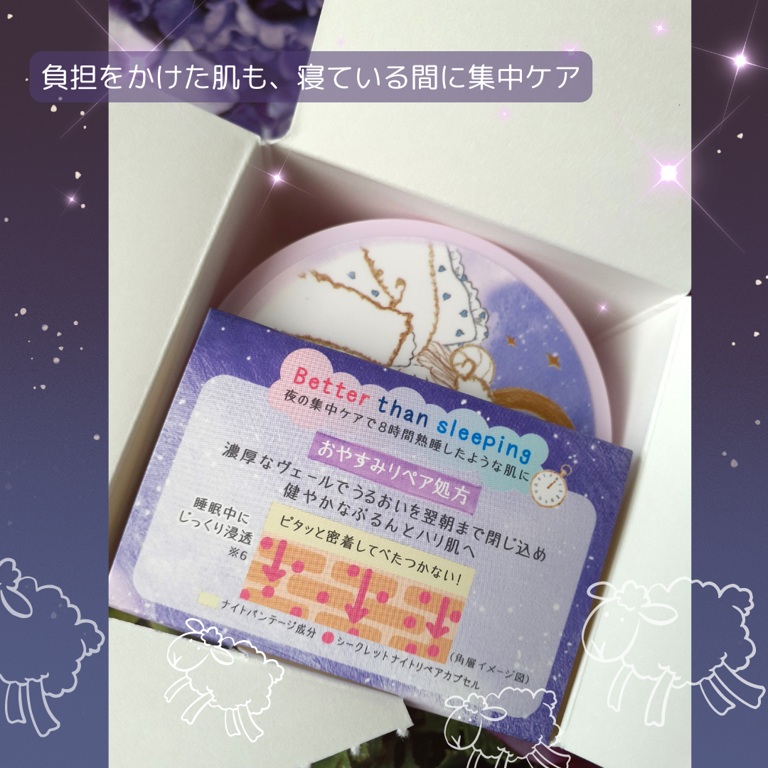 女の子のパケが可愛すぎ🤍 寝ている間に日中受けたダメージ*を集中リペア。 テクスチャーはけっこう固め。 シアバターのようにとろけて肌になじむ感じ。 乾燥しやすい季節にぴったり! あれがちな肌にも使いやすい低刺激設計(弱酸性・無香料・紫外線吸収剤フリー・無着色・アルコールフリー)なのも嬉しい✨