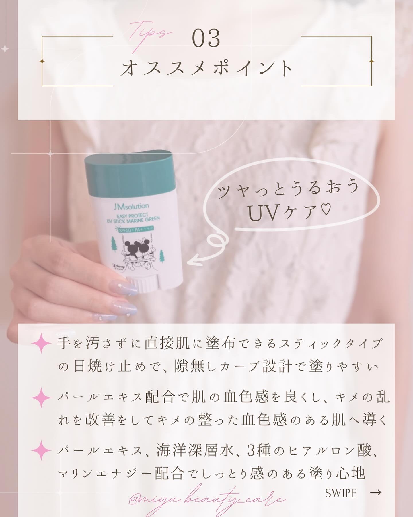 JMsolutionイージープロテクトUVスティックマリングリーン🟢肌を美しく魅せる美容成分配合🌸SPF50+PA++++顔、からだ、化粧下地にも使えるみたいᐕ)ノ日焼け止めスティックになります。暑い日が続く中、毎年色んな日焼け止めを使ってき...