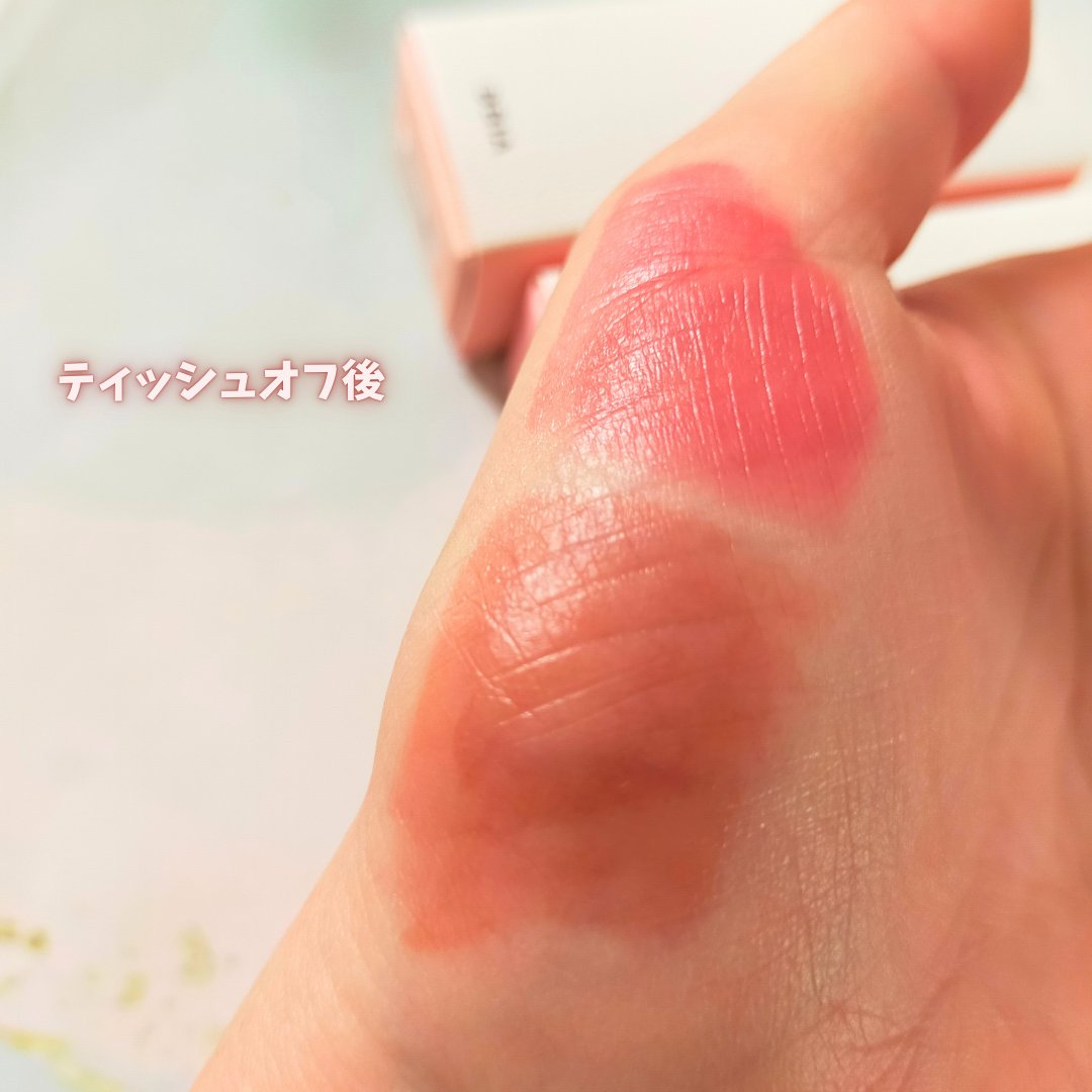 水っぽいテクスチャーのティントです。唇にのせるとうるうるツヤツヤになります。 ティッシュオフしてもカラーが残っているのでマスクメイクにもおすすめ! しっとり感もあるので冬でもつけてます。 #03ブリック リバーはオレンジ、ブラウンが少し入ったような落ち着きのある赤みなので大人リップにもいい感じです。
