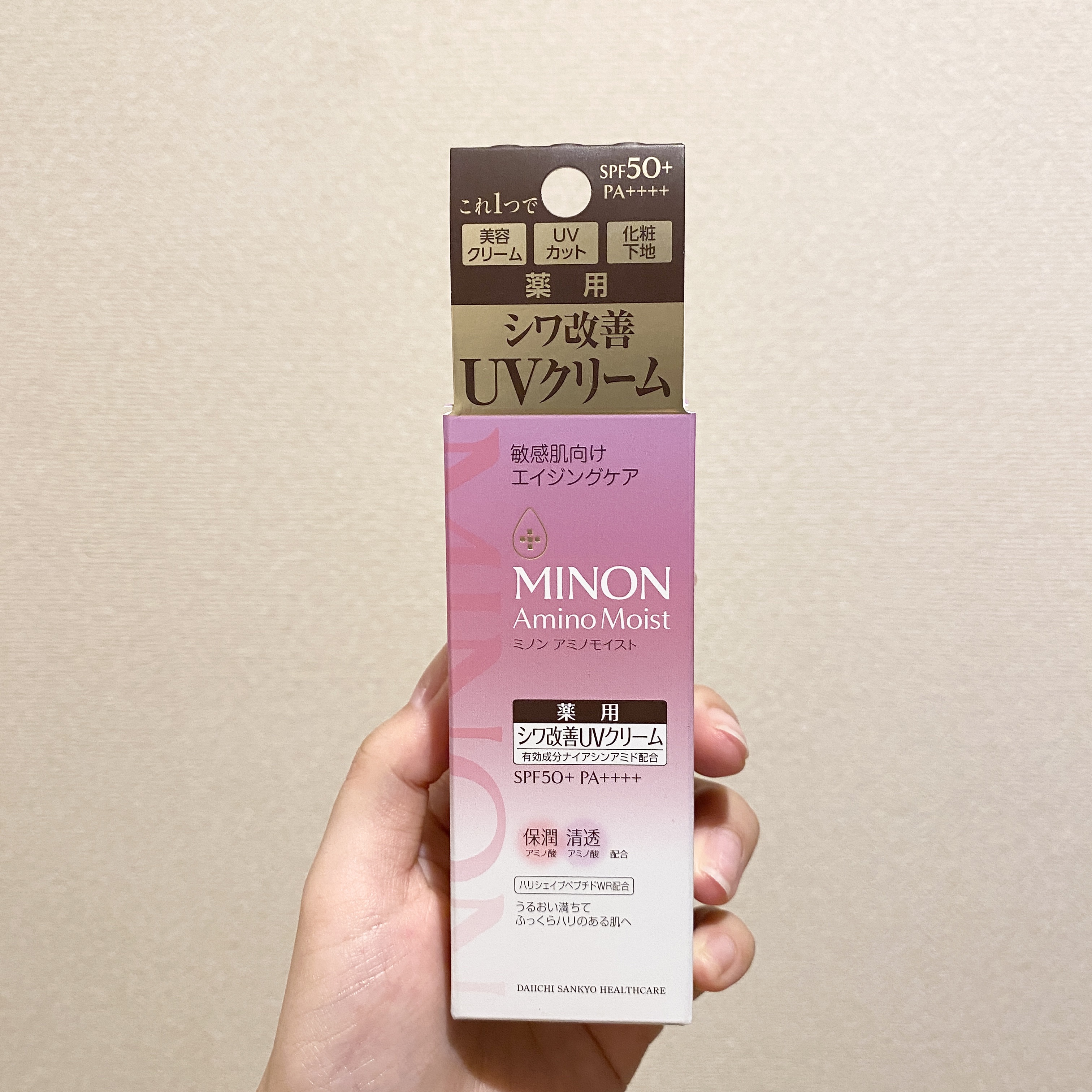 - 【シワ改善もできるUVクリーム】 SPF50+PA++++ シワ改善×UVカットが出来る薬用シワ改善UVクリーム。これ1本で美容クリーム・UVカット・化粧下地の3役。 シワ改善&しみ*予防成分「ナイアシンアミド」、肌あれ予防成分「グリチルリチン酸2K」配合。紫外線吸収剤&酸化亜鉛フリーで敏感肌を考えた処方。自然な輝きを放つ、やわらかなテクスチャーの化粧下地、見る角度で反射色が変わる「艶肌ダブルカラーパウダー」配合で自然な立体感を演出。 エイジングケア:年齢に応じたお手入れケア *メラニンの生成を抑え、しみ・そばかすを防ぐ (販売名:ミノンアミノモイストAU)【医薬部外品】