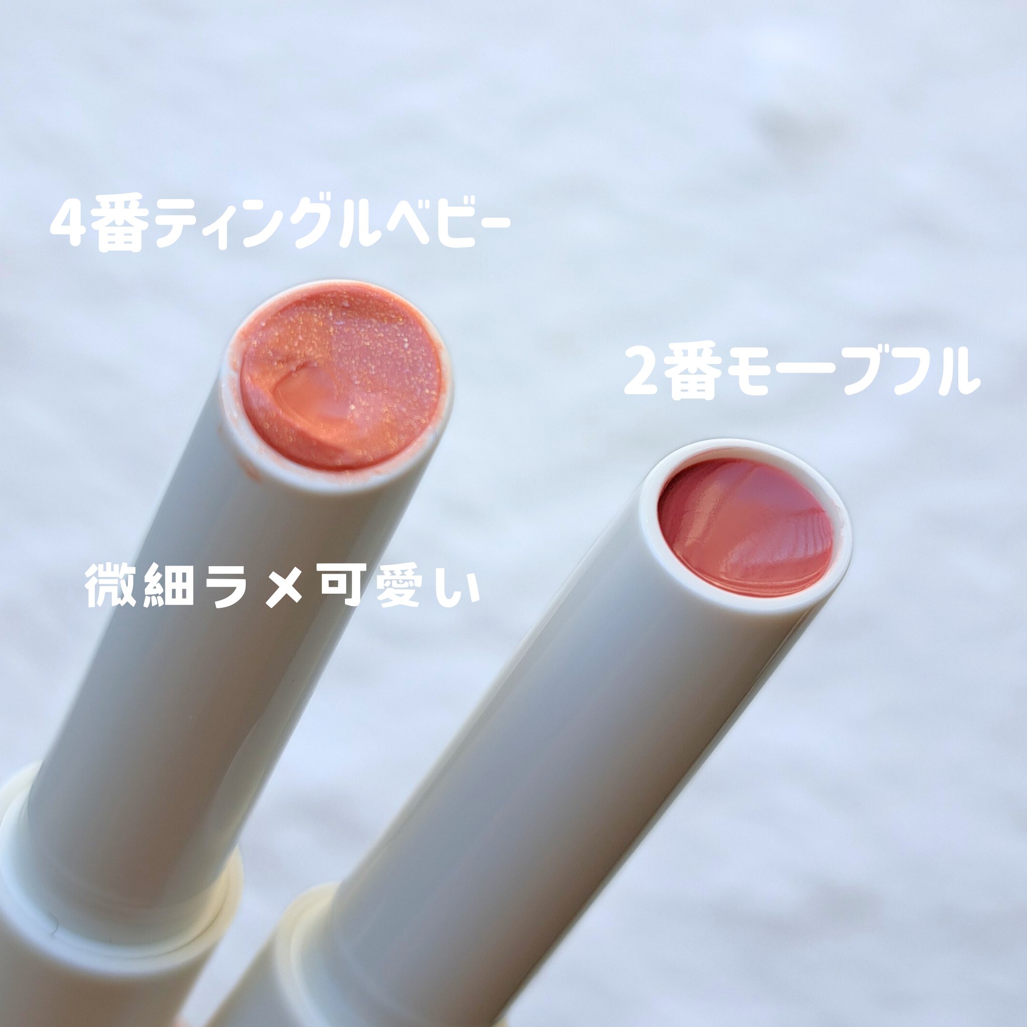 ひと塗りでツヤとボリュームが出るバームリップ💄 水分たっぷりとろけるもちもちテクスチャー💋 うるおいツヤで唇を立体的に見せてくれます👏 02 モーブフル ぼぶはイエベ秋ですが青みが強すぎず使いやすいモーブでした💜 04 ティングルベビー ゴールドパール入りのオレンジコーラル🧡 明るめのナチュラルカラーで日常使いしやすい色味です💕