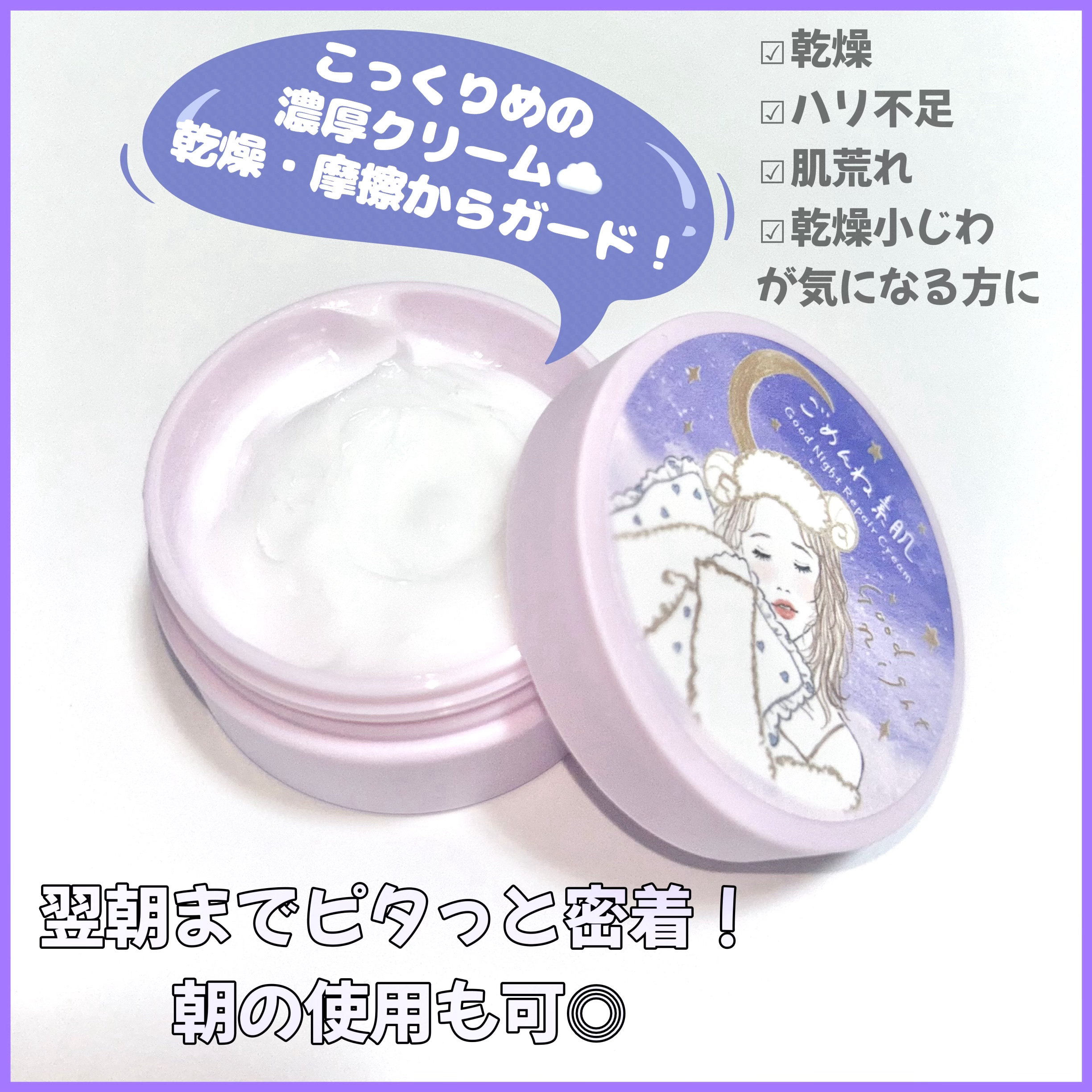 - 日中に負担をかけてしまった肌*を、寝ている間に集中ケアできる『おやすみリペアクリーム』 ①負担をかけた肌*も、寝ている間に集中ケア 摩擦感なく伸び広がり、ピタッと密着。夜の肌刺激(乾燥・摩擦)から守りながら、日中受けたダメージ*を集中ケアし、8時間熟睡したような肌へ導きます。 ②あれがちな肌にも使いやすい低刺激設計 弱酸性・無香料・無着色・アルコールフリー・パラベンフリー・紫外線吸収剤フリーの低刺激処方で、やさしい使い心地です。 *乾燥による