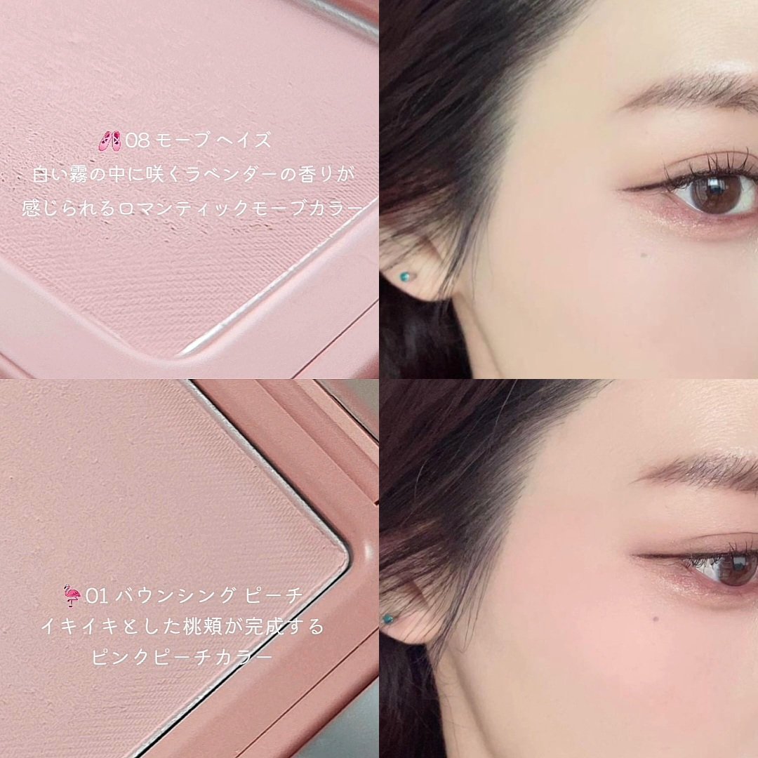 - 柔らかいベルベットパウダーがムラなく密着し、 くすみにくく明るい印象が続くブラーリングチークです。