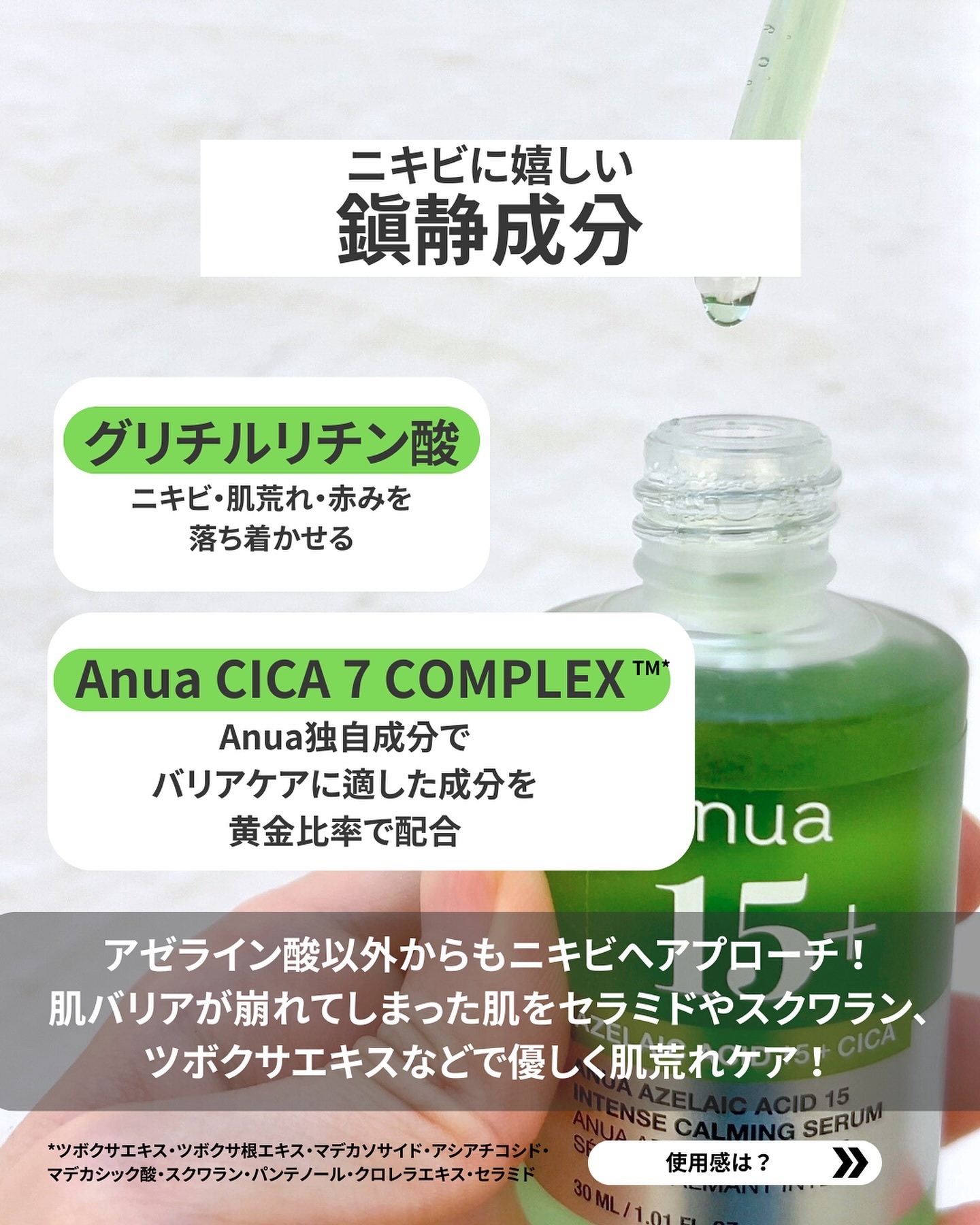 アゼライン酸が15%も配合!🌻🫧 肌荒れには15%以上必要と言われてるので、この濃度は嬉しい◎ ニキビへの効果も期待大!✨️ ピーリング成分も入ってるので、毛穴詰まりや余分な皮脂にもアプローチ! ニキビのある人はこれ一本持ってるだけで、安心感ハンパない! 皮脂をしっかり抑えてくれるので、化粧崩れしやすい人にも◎