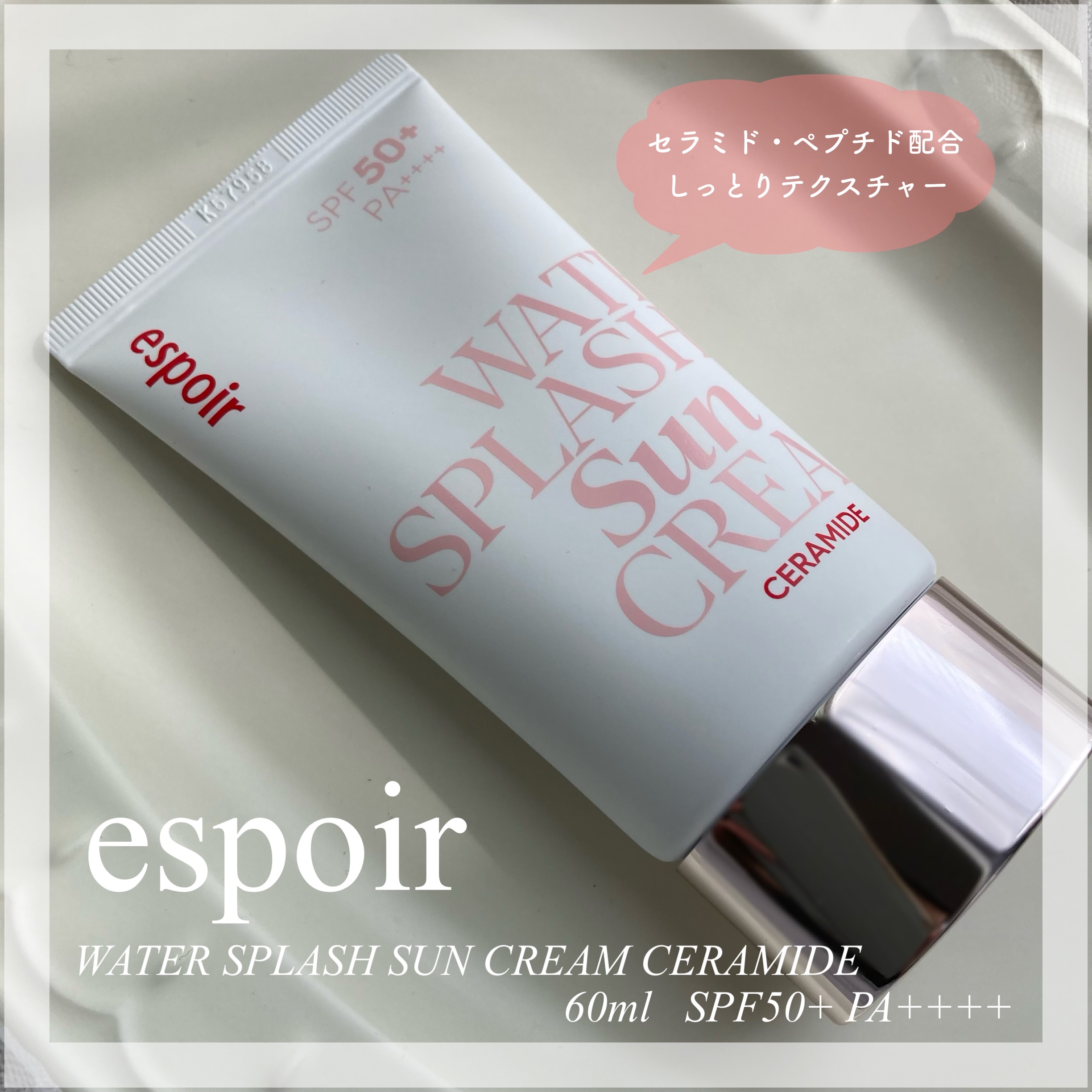espoirウォータースプラッシュサンクリームセラミド60ml💜SPF50+PA++++💜保湿重視のピンク系日焼け止め下地‼️花粉の時期はいつも乾燥するし肌が荒れて赤くなって大変で💦下地を塗ると皮がめくれてきたりするんだけど、これは皮がめくれ...
