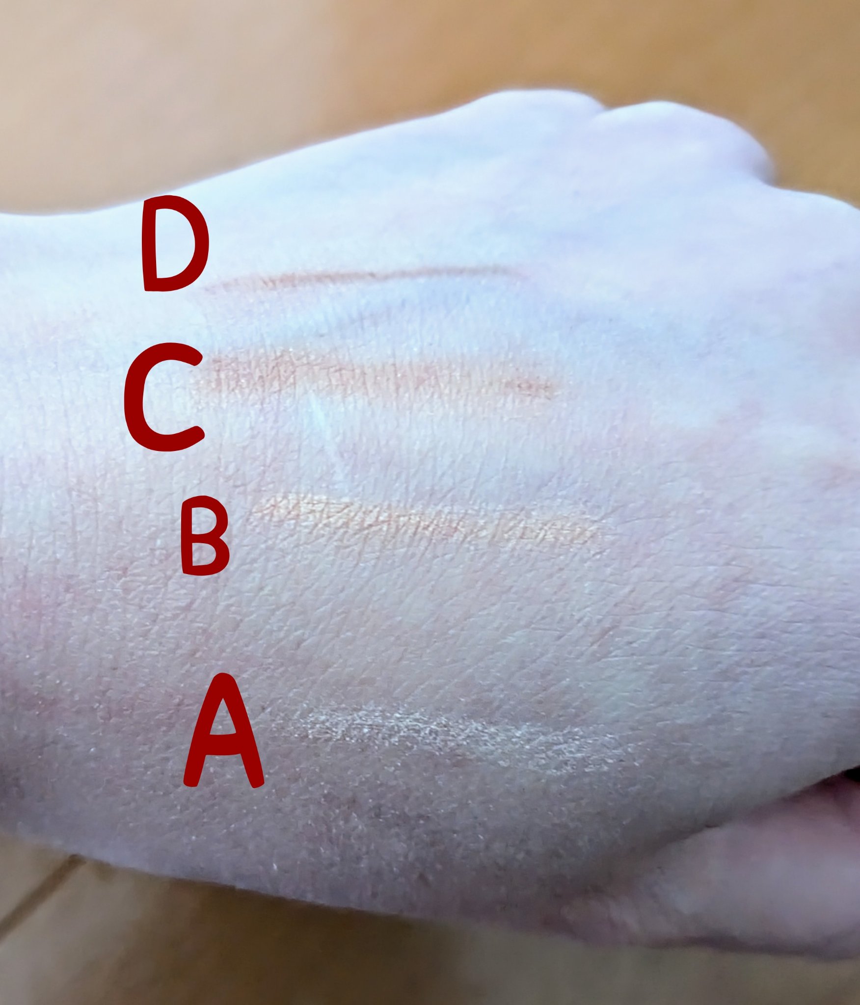- <ピンクモーヴ> タルク、ジメチコン、パルミチン酸エチルヘキシル、コーンスターチ、ステアリン酸Mg、ケイ酸(Na/K/Al)、トリメリト酸トリトリデシル、アルガニアスピノサ核油、シリカ、メタクリル酸メチルクロスポリマー、PEG-10ジメチコン、ポリイソブテン、ミネラルオイル、(エチレン/プロピレン/スチレン)コポリマー、(ブチレン/エチレン/スチレン)コポリマー、フェノキシエタノール、メチルパラベン、エチルパラベン、〔+/-〕マイカ、合成フルオロフロゴパイト、ホウケイ酸(Ca/ Al)、酸化チタン、酸化スズ、酸化鉄、赤201、赤202、黄4、グンジョウ、マンガンバイオレット <ベージュブラウン> タルク、トリメリト酸トリトリデシル、ステアリン酸Mg、パルミチン酸エチルヘキシル、ジメチコン、コーンスターチ、メタクリル酸メチルクロスポリマー、シリカ、セチルジメチコン、アルガニアスピノサ核油、ケイ酸(Na/K/Al)、ポリイソブテン、PEG-10ジメチコン、カプリリルグリコール、ミネラルオイル、(エチレン/プロピレン/スチレン)コポリマー、(ブチレン/エチレン/スチレン)コポリマー、フェノキシエタノール、メチルパラベン、エチルパラベン、〔+/-〕マイカ、合成フ ルオロフロゴパイト、ホウケイ酸(Ca/Al)、酸化チタン、酸化スズ、酸化鉄、黄4 <オレンジブラウン> タルク、トリメリト酸トリトリデシル、コーンスターチ、パルミチン酸エチルヘキシル、ステアリン酸Mg、ジメチコン、シリカ、メタクリル酸メチルクロスポリマー、ケイ酸(Na/K/Al)、アルガニアスピノサ核油、ポリイソブテン、PEG-10ジメチコン、ミネラルオイル、(エチレン/プロピレン/スチレン)コポリマー、(ブチレン/エチレン/スチレン)コポリマー、フェノキシエタノール、メチルパラベン、エチルパラベン、〔+/-〕マイカ、合成フルオロフロゴパイト、ホウケイ酸(Ca/Al)、ホウケイ酸(Ca a)、酸化チタン、酸化スズ、酸化鉄、赤201、赤202、マンガンバイオレット