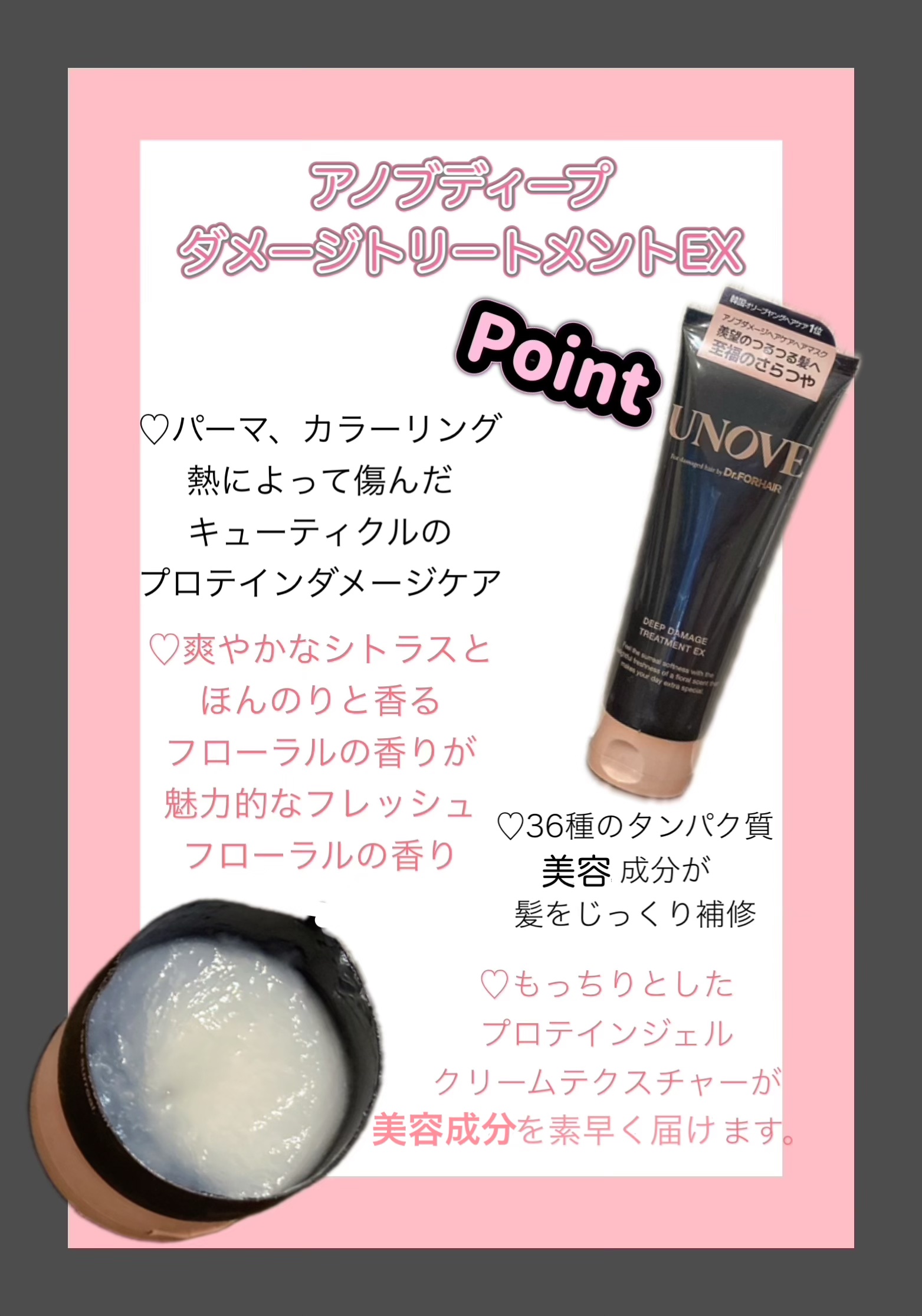 UNOVEディープダメージトリートメントEX36種類のタンパク質、美容成分配合のリピーター続出タンパク質トリートメントこっくり固めのテクスチャーで、洗い流した時の指通りの良さと乾かした時のサラサラだけどまとまりも良い感じがお気に入りです💭上品...