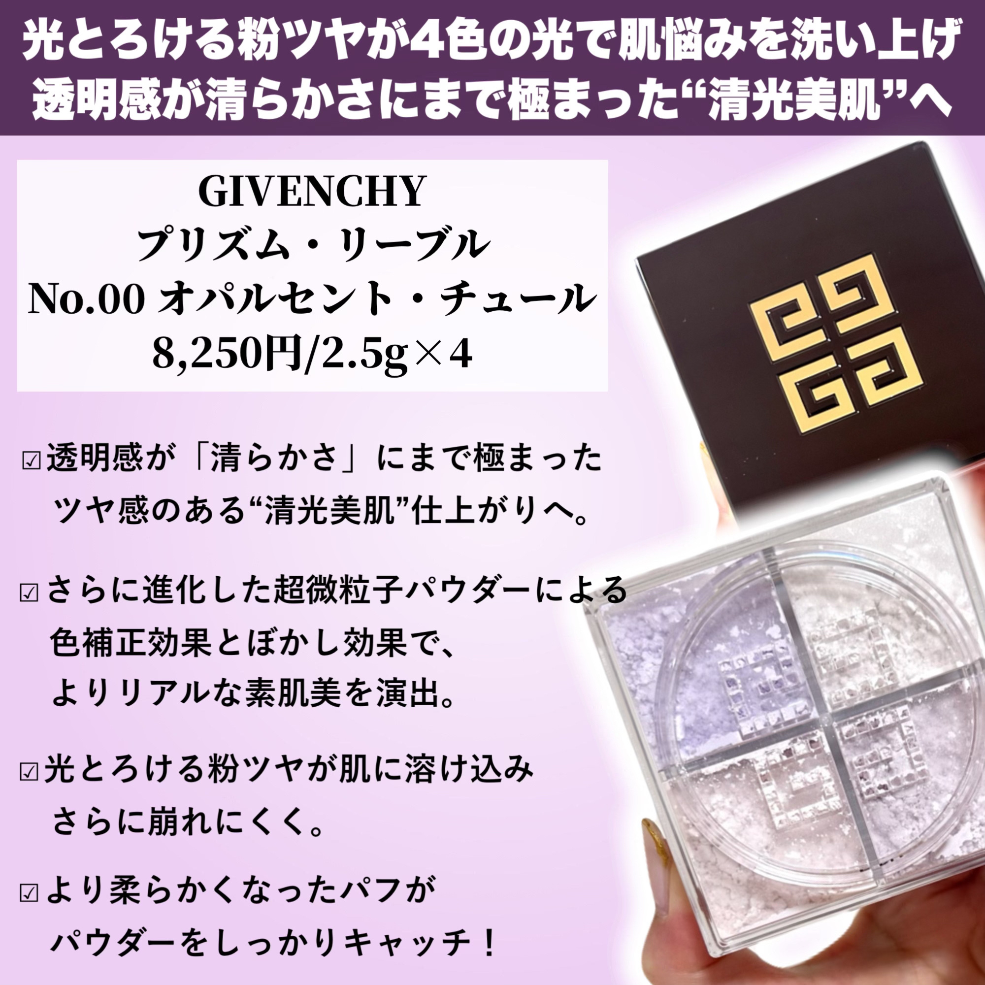 GIVENCHYプリズム・リーブルNo.00 オパルセント・チュール超微粒子のパウダーがリアルな素肌美を演出。立体感のある粉ツヤを実現。崩れにくく、色補正力、ぼかし効果も◎No.00は清らかな澄み肌を叶えるユニバーサルシェード。繊細なパール配...