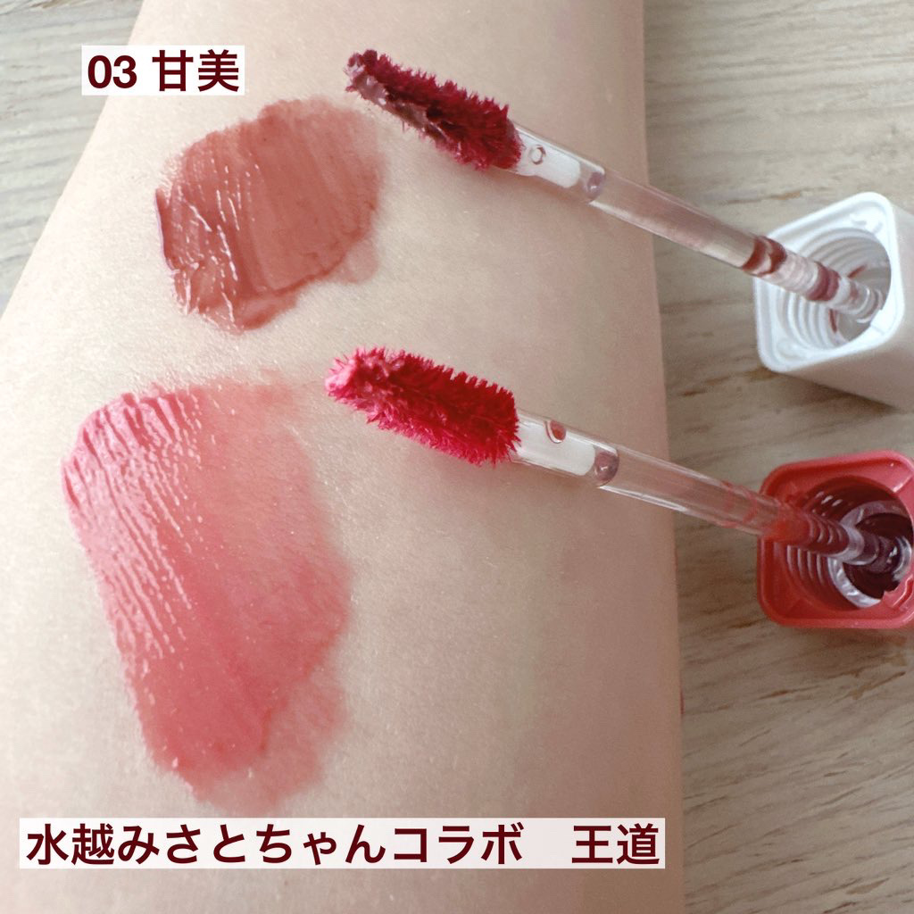 イエベブルベ関係なく使える王道カラー🫶 ヒリヒリしすぎないプランプ感/色持ちの良さは今までのものと同様、どんなメイクにも合わせやすい使いやすいカラーが最高🥹! ぷるぷるな仕上がりなところも推せる💋 人気色"甘美"と比べると鮮やかなピンクなのがよく分かります💗