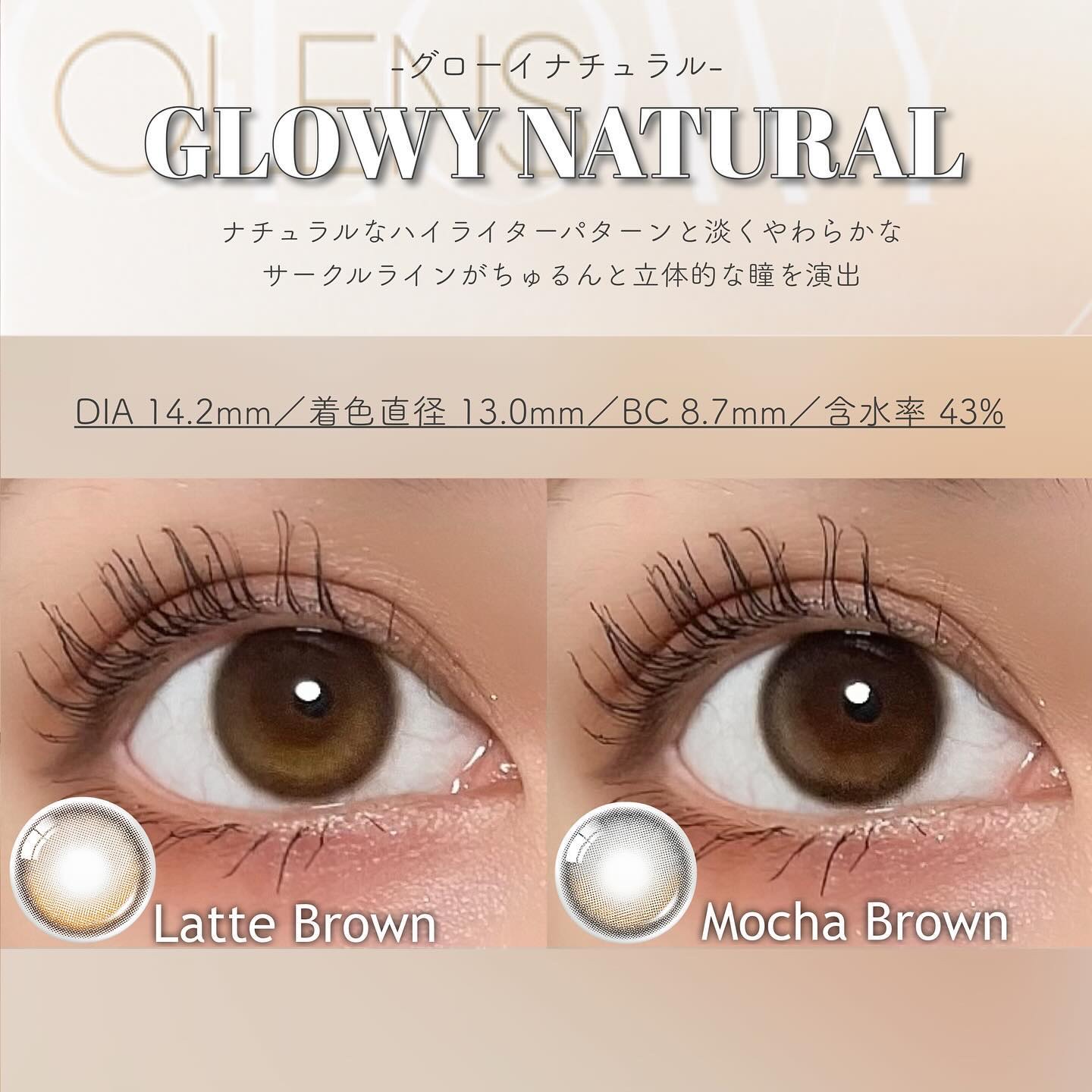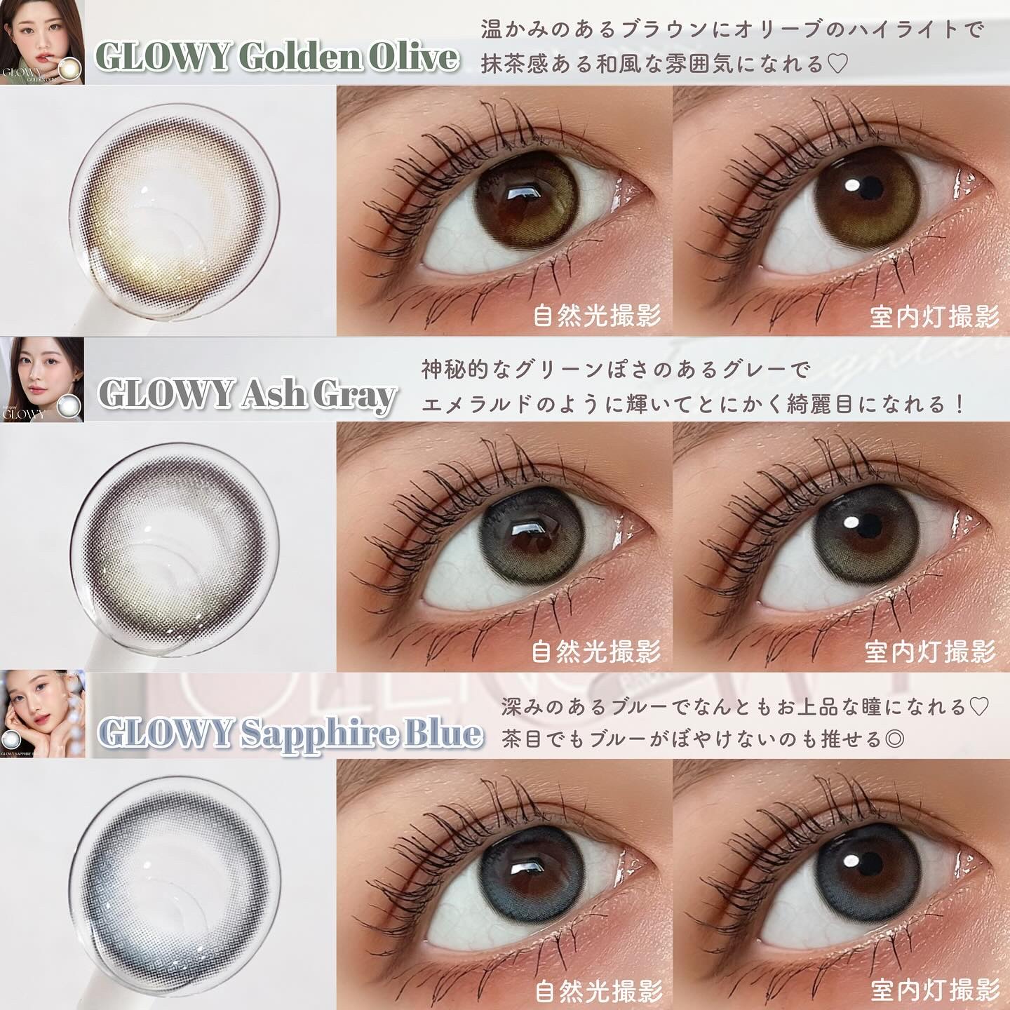 水光カラコンと言えば𝗢𝗟𝗘𝗡𝗦 𝗢𝗟𝗘𝗡𝗦と言えば𝗚𝗟𝗢𝗪𝗬🇰🇷 グローイの中でも1番王道なブラウンはダークブラウンにミルクブラウンのハイライトでま!じ!で!光の入りが超自然で群を抜いて綺麗✨💫 最近登場したブルーの水光💙濃く深みのあるブルーが深海から上を見上げてるような光り方🌊
