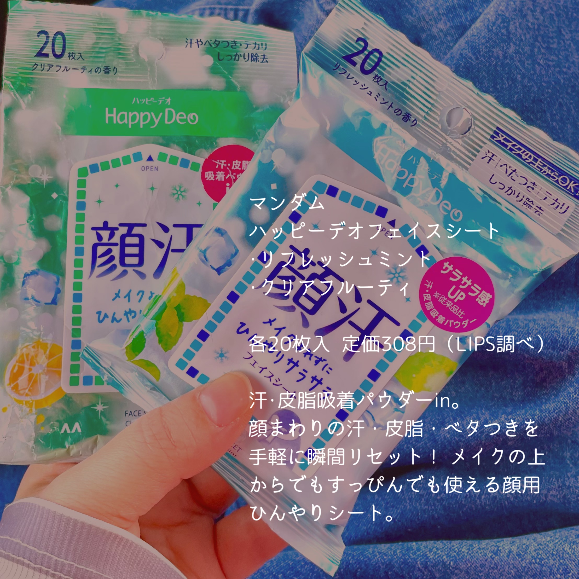 マンダムHappyDeo(ハッピーデオ)フェイスシート.メイクの上からでもすっぴん時でも使えて、顔汗や皮脂・ベタつき・テカリをオフできるフェイスシート。さっぱりとしたリフレッシュミントの香りです🌱.汗吸着パウダーと皮脂吸着パウダーを配合し、使...