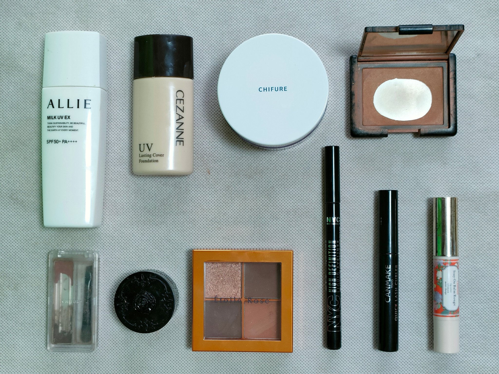 アリィー ニュアンスチェンジUV ジェル RSを、顔全体にまんべんなく塗ります。 RMK RMK ジェルクリーミィファンデーション 103を、顔全体にまんべんなく塗ります。 ジョンソンベビー ジョンソン ベビーパウダーを、顔全体にまんべんなく軽くはたきます。 THE BODY SHOP bronze shade warm glowを、両頬に塗ります。 KATE リフレクトミラーアイズ BR-1の締め色を、眉毛全体にまんべんなく塗ります。 URGLAM UR GLAMBLOOMING EYE COLOR PALETTE 01を、使用しました。 ちふれ リキッド アイライナー 筆ペンタイプ BK30 ブラックを、塗ります。 CEZANNE エアリーカールマスカラを、まつ毛全体にまんべんなく塗ります。 MAYBELLINE NEW YORK コロッサルボリュームエクスプレスを、まつ毛全体にまんべんなく塗ります。 MAYBELLINE NEW YORK SPステイ マットインク 135を、唇全体にまんべんなく塗ります。